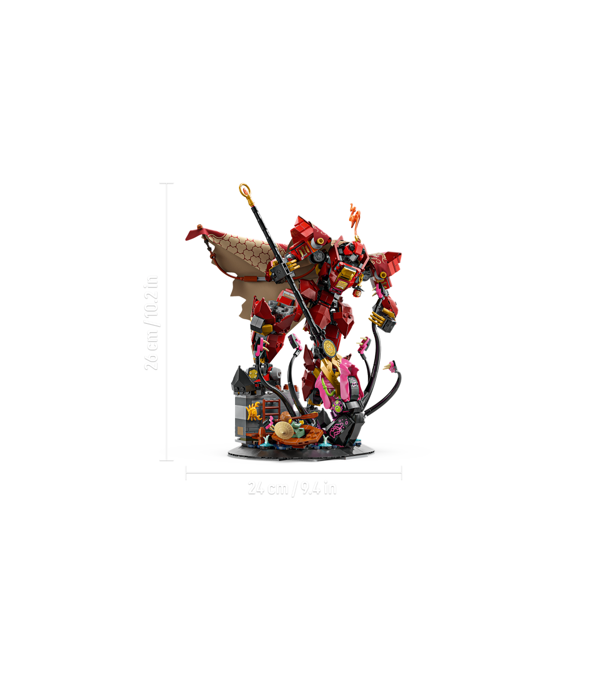 • Mõõdud – selle 996-osalise ehituskomplekti robot on 26 cm pikk, kui see seisab esitlusalusel koos oma odaga
