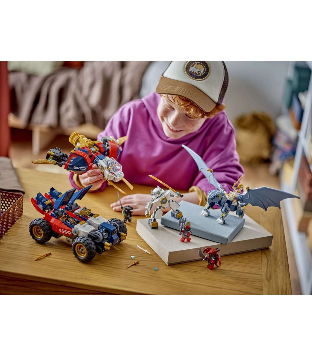 • 6 LEGO® NINJAGO® minifiguuri – selles seiklusmängukomplektis on ninjad Sora ja Cole ning nende liitlane Pixal, kes astuvad vastu kurikuulsale kolmikule: Nokt, draakonisõdalane ja draakoniskaut