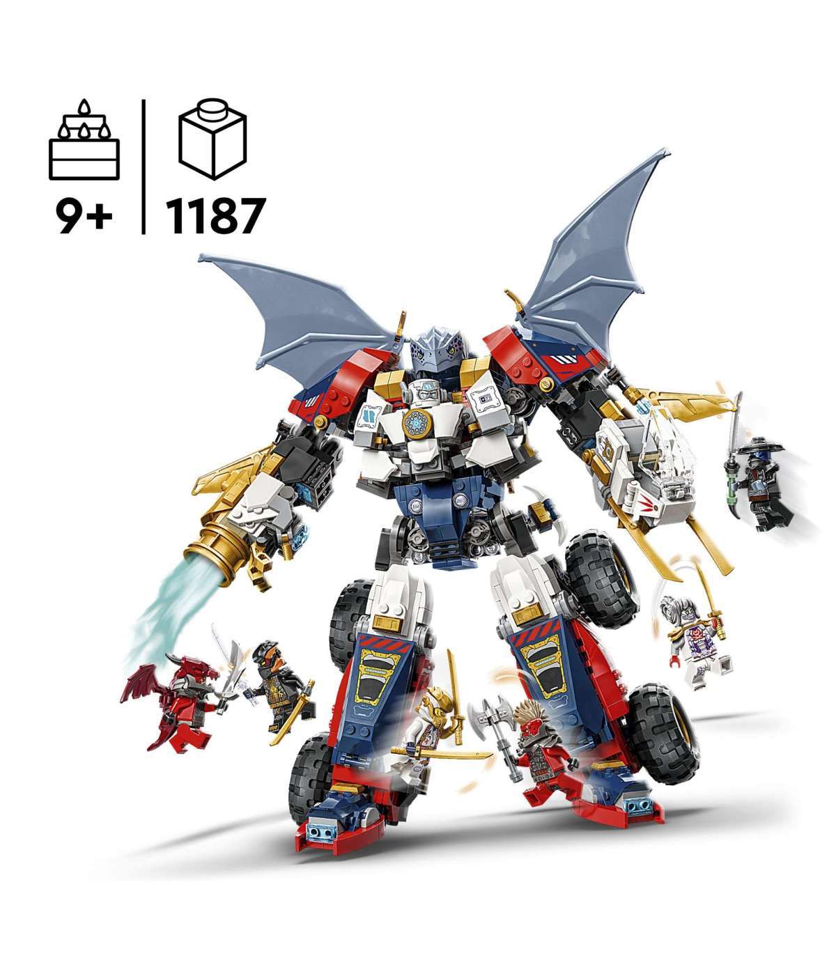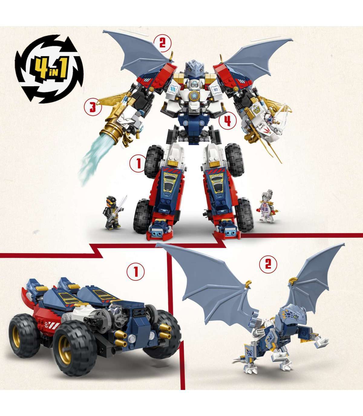 • Neli ühes robotimänguasi lastele – 9-aastased ja vanemad poisid ja tüdrukud saavad taasluua tegevusi sarja NINJAGO® Dragons Rising 3. hooajast selle Zane’i Ultra robotikomplektiga
