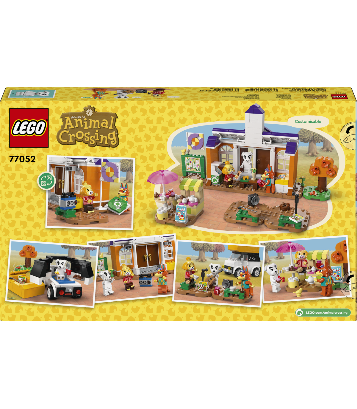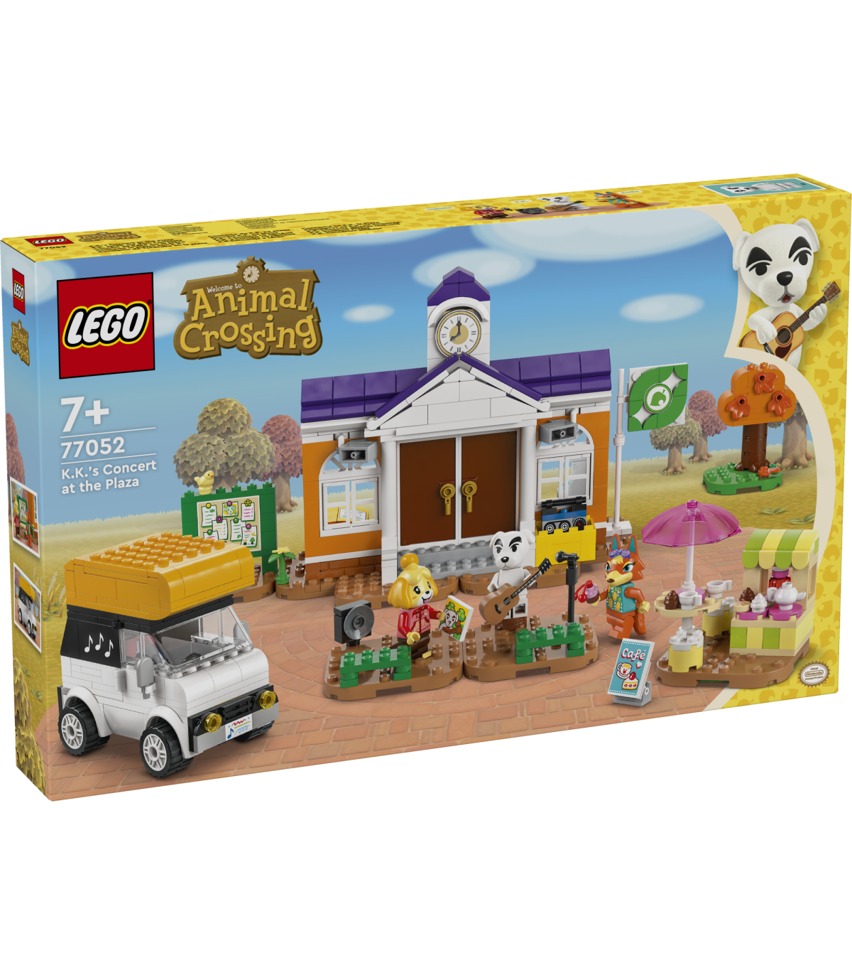• 3 äratuntavat Animal Crossing™-u tegelast– selles klotsidest ehitatud mängukomplektis on K.K., Isabelle'i ja Audie minifiguurid, Resident Servicesi mudel koos kohvikuga ja juhitav matkaauto