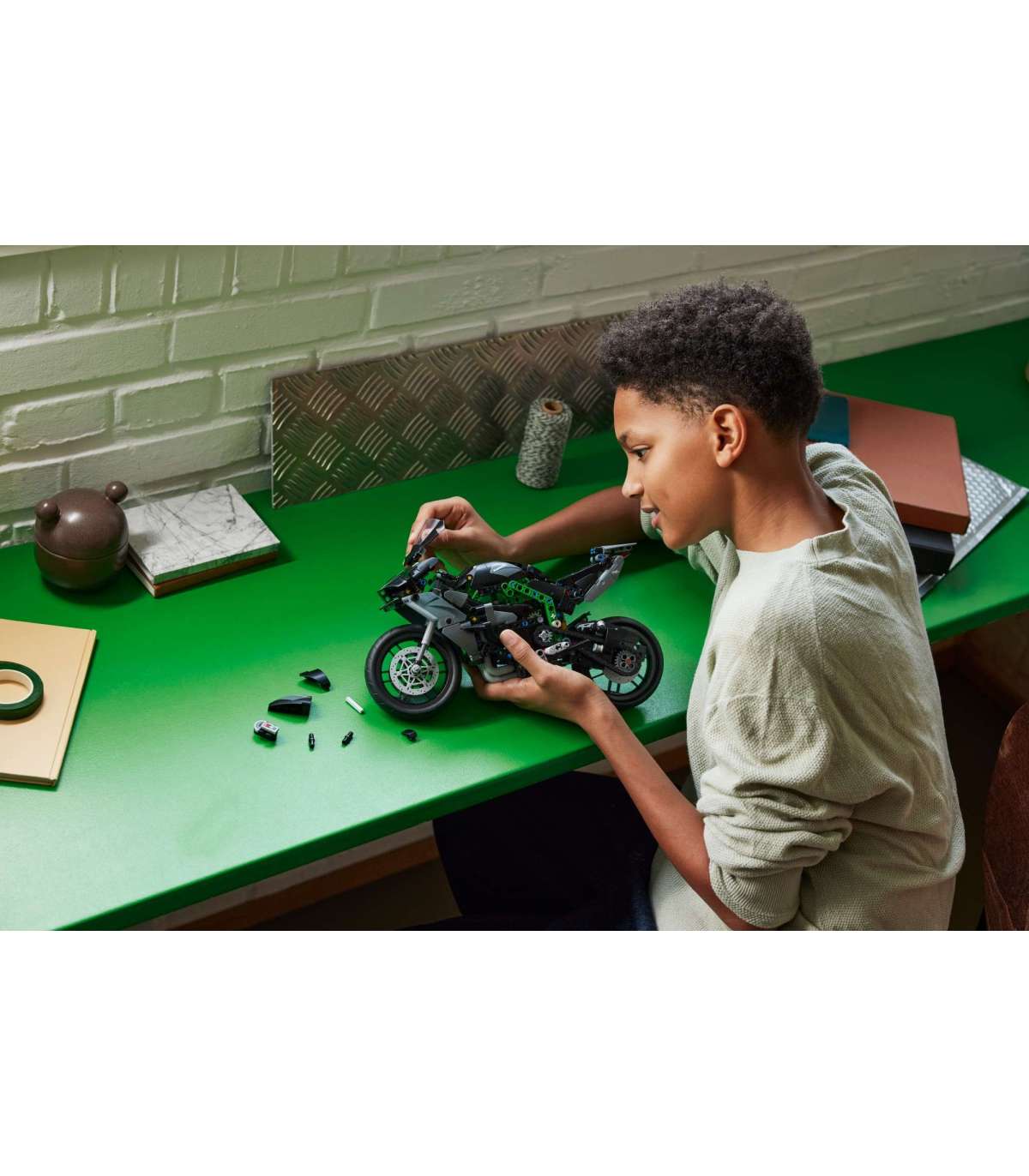 • 1:8 mootorratta mõõtkavas mudelikomplekt – see Kawasaki mudelmootorratas, mis on kujundatud hämmastava tähelepanuga detailidele, sisaldab tugijalga, et lapsed saaksid oma kogutava mudeli esitlemiseks välja panna