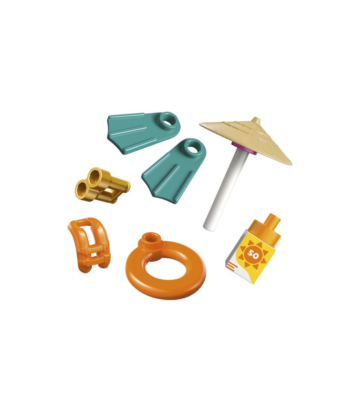 • Sõiduki mängukomplekt koos tarvikutega – selle LEGO® reisikomplektiga on kaasas rollimängutarvikud, sealhulgas 2 veeskuutrit, surfilaud, ujumislestad, päästevestid, söök ja palju muud