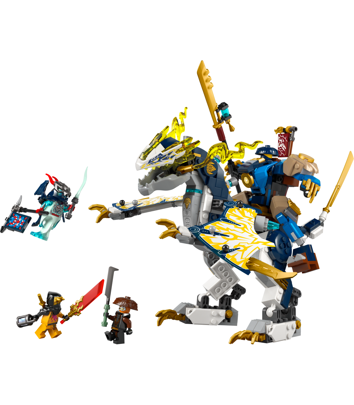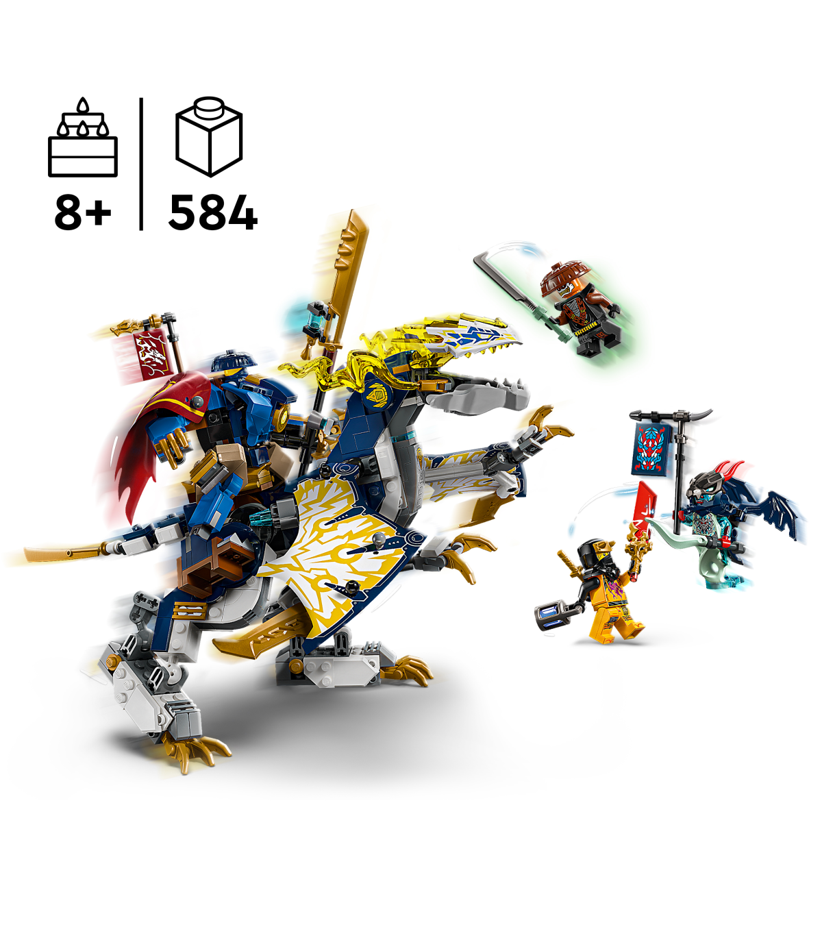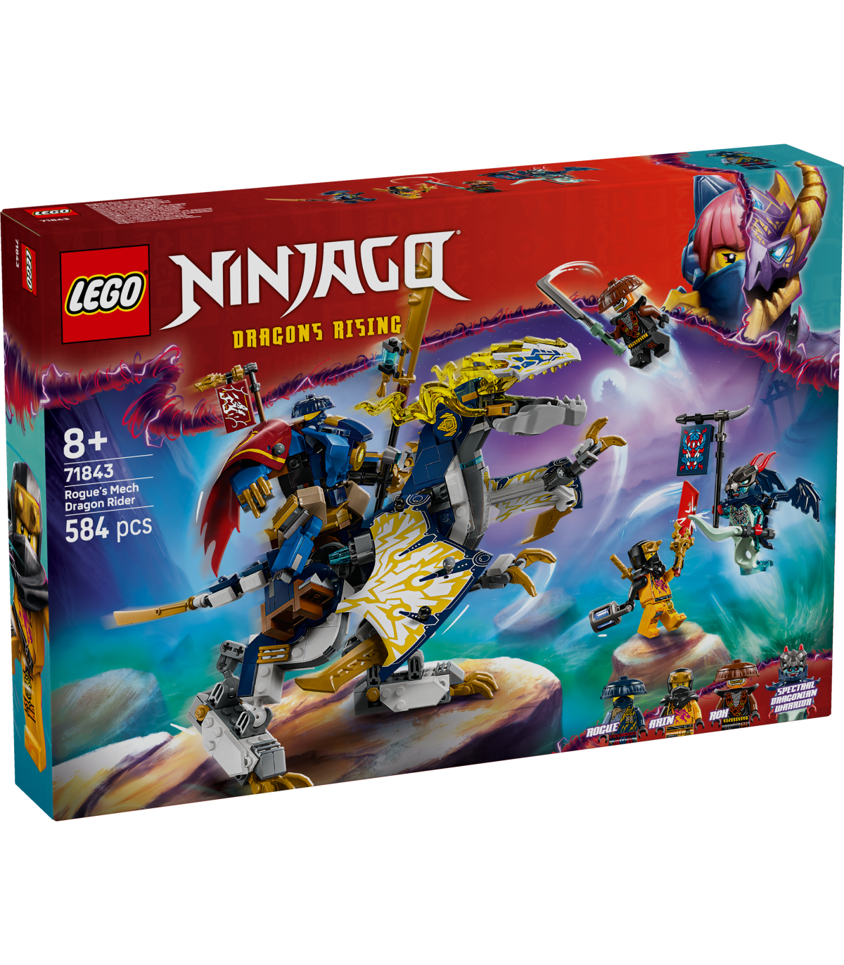 • Ninjamänguasi lastele – 8-aastased ja vanemad poisid ja tüdrukud saavad etendada lahingustseene 3. hooajast sarjast NINJAGO® Dragons Rising selle Rogue'i roboti draakonisõitja seiklusmänguasjaga