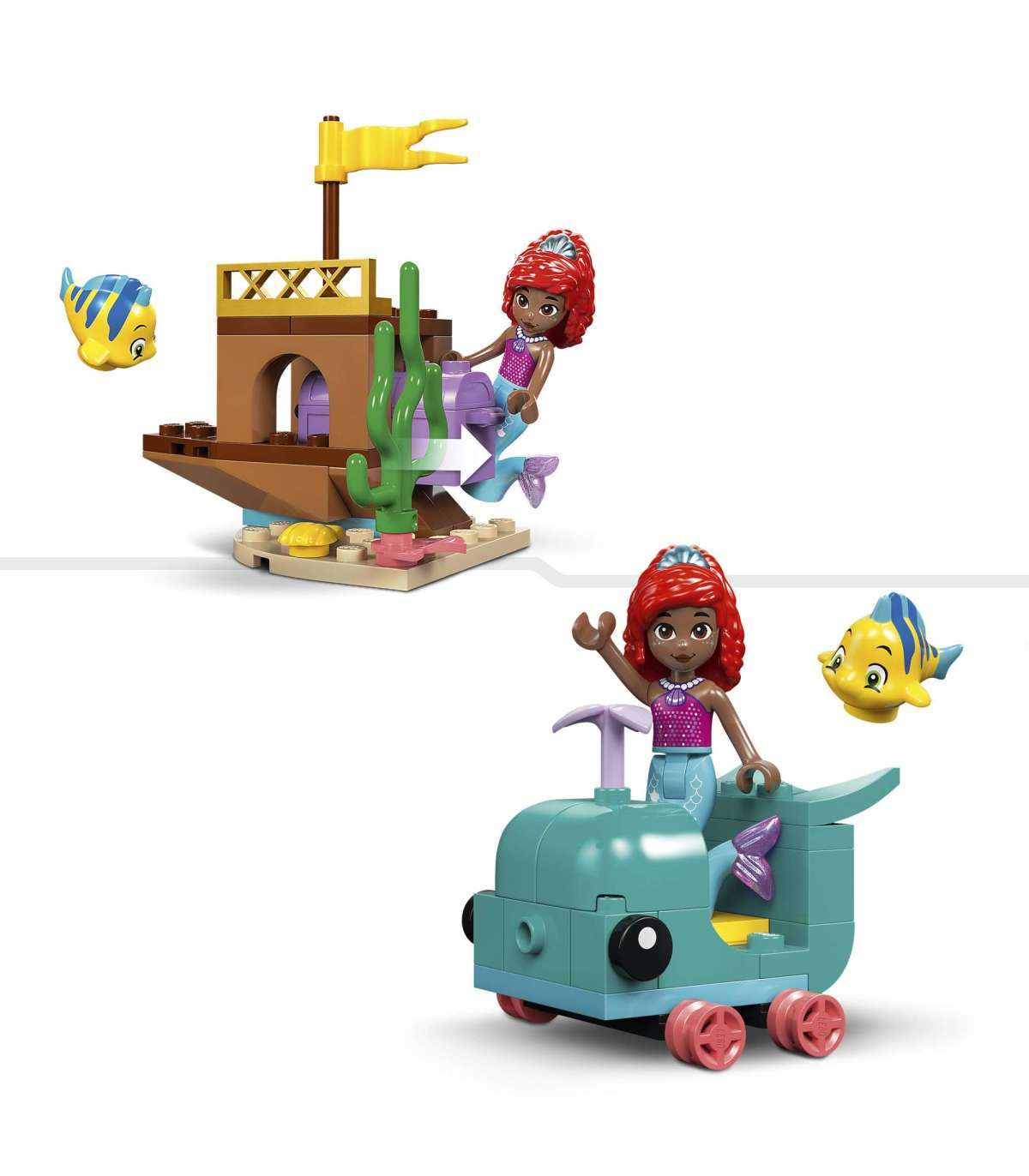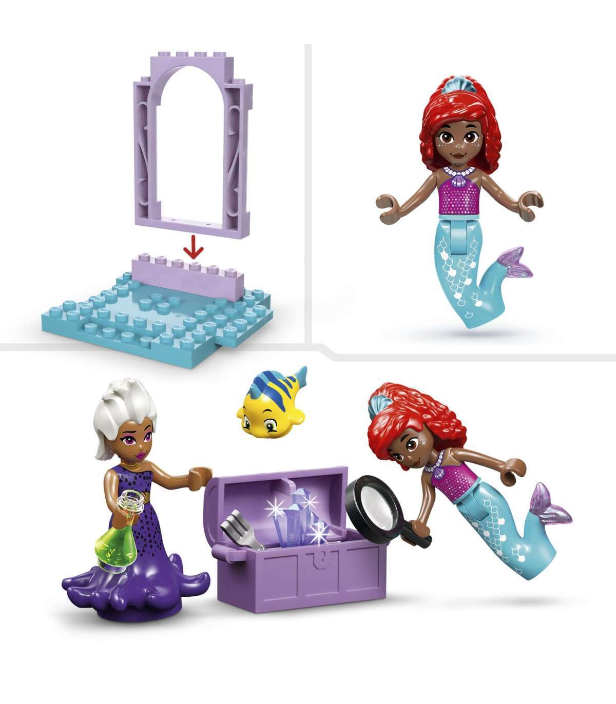 • Ehitusmängukomplekt – see Disney kokkupandav mänguasi sisaldab vaalasõidukit, peidetud aardekirstuga laevavrakki ja maagiliste jookide ala koos laua, paja ja joogipudelitega Ursula jaoks