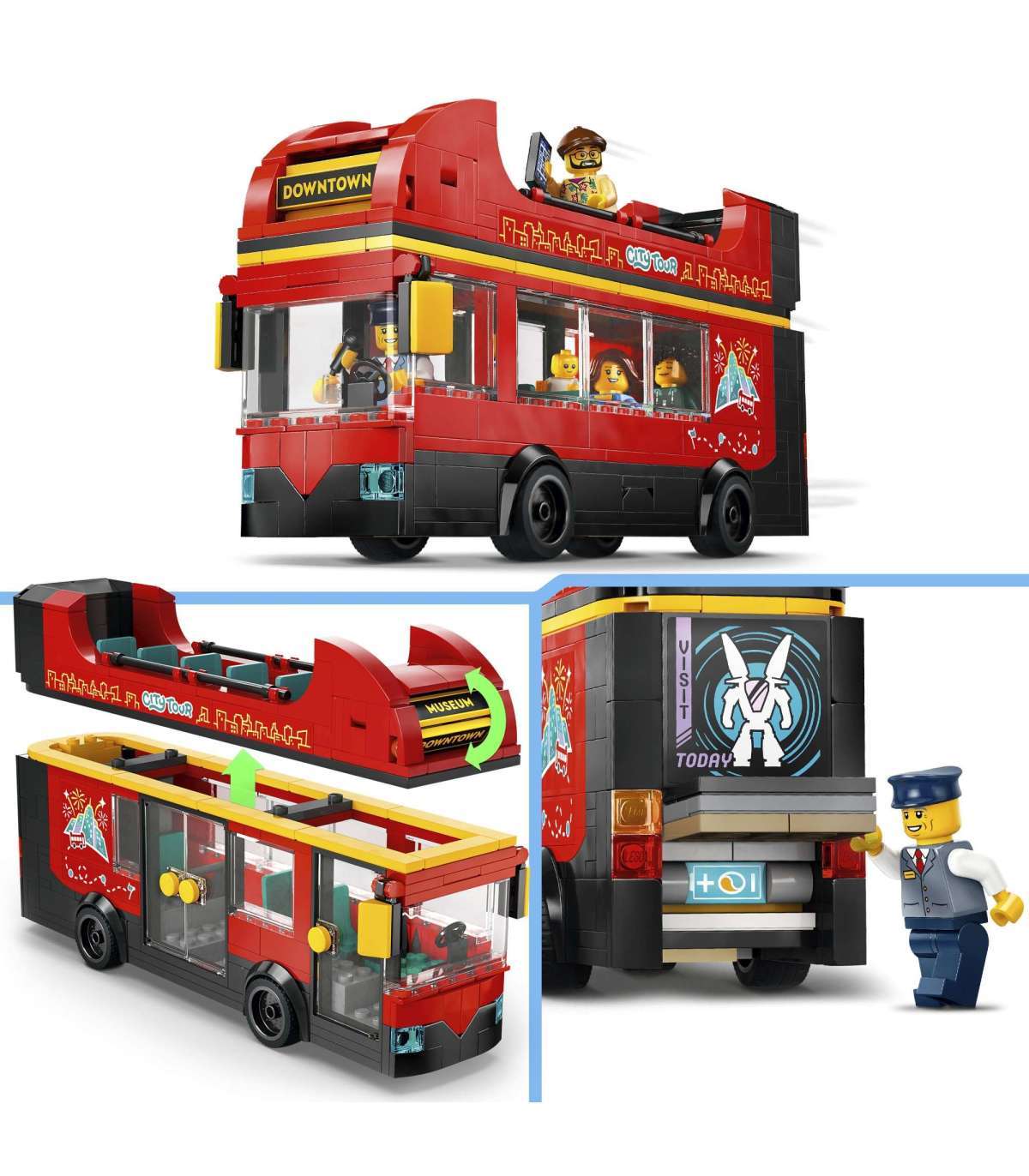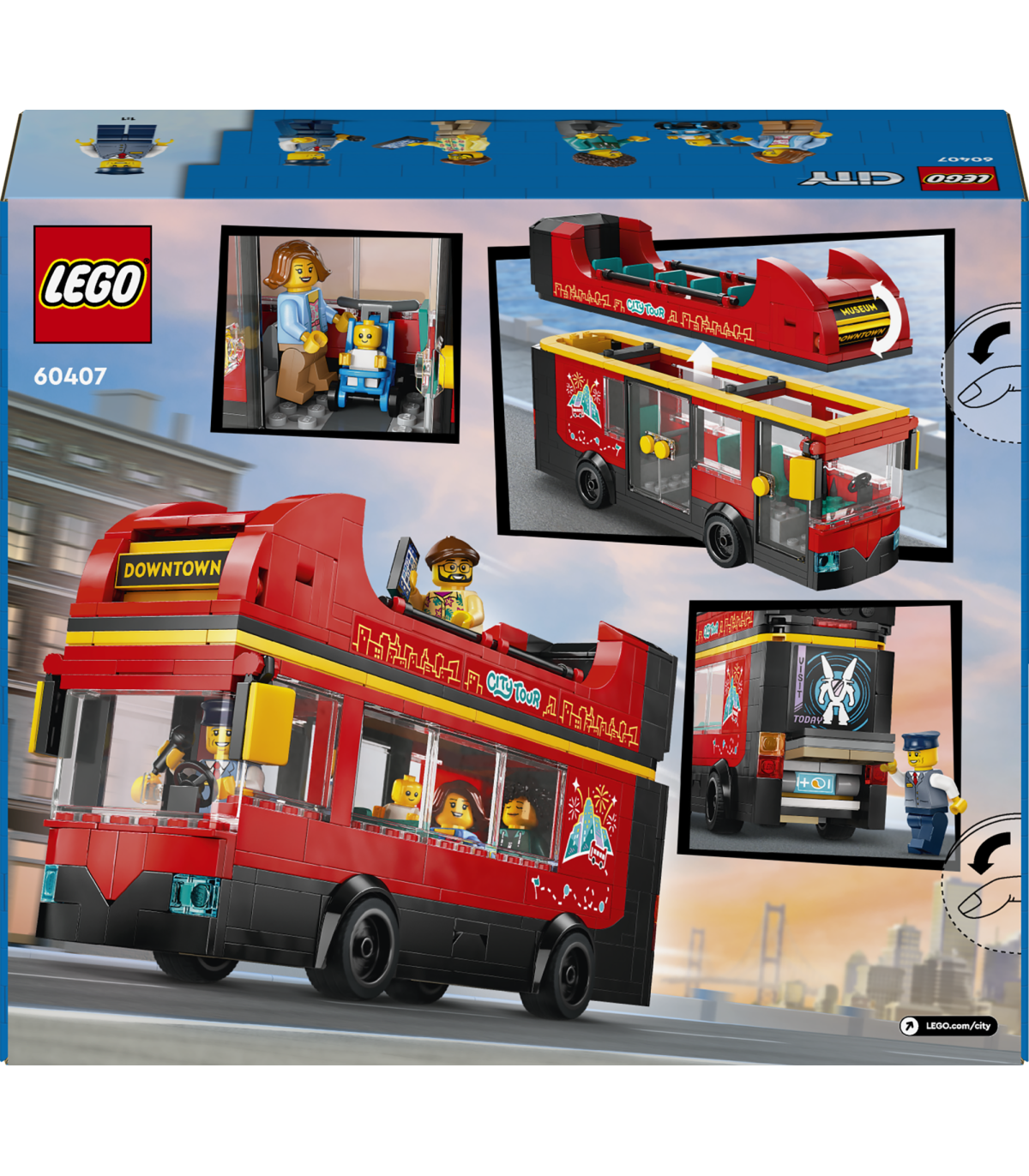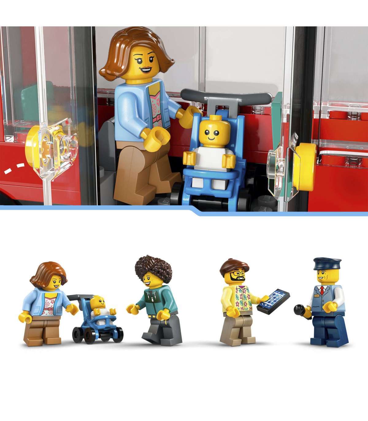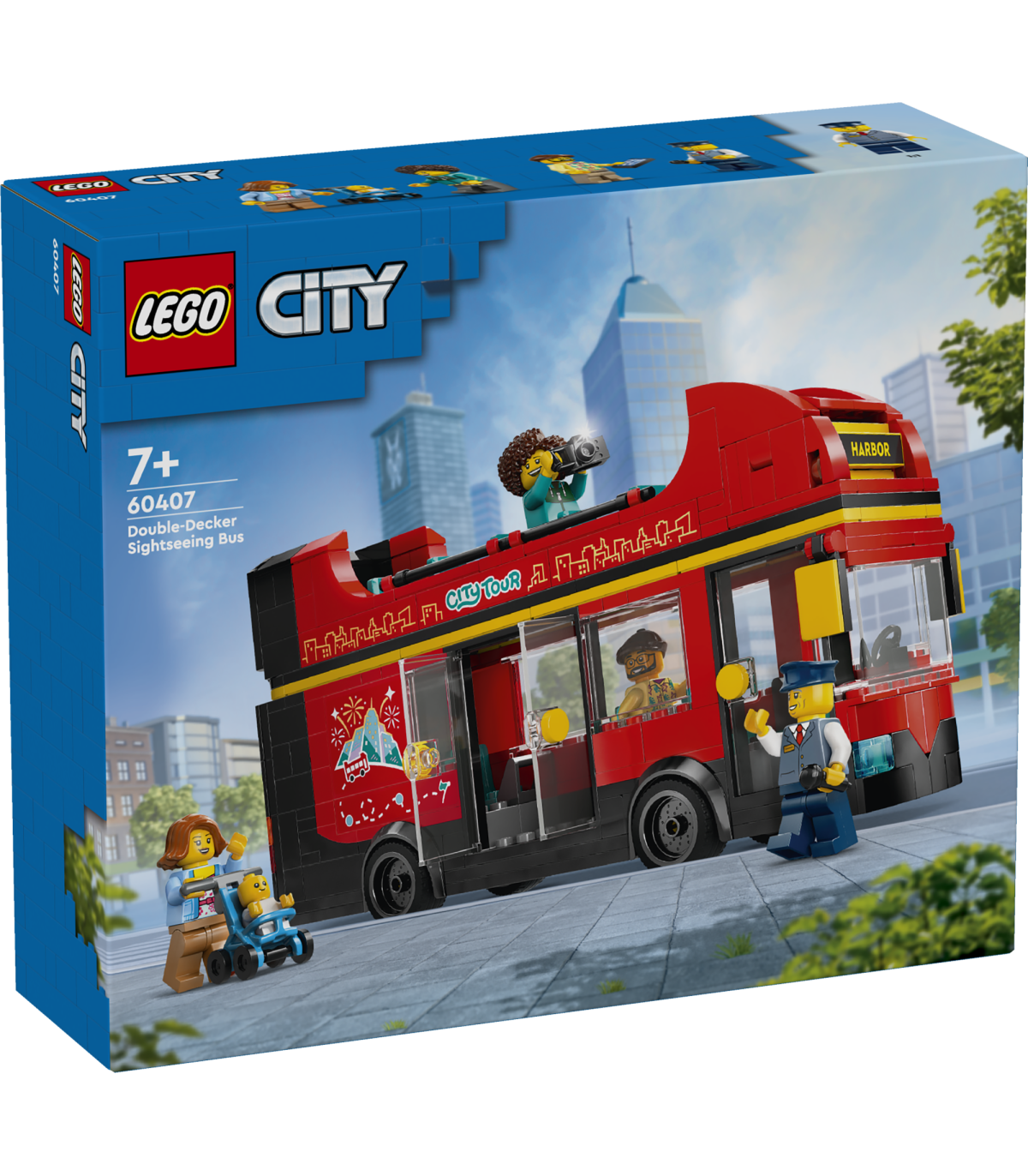 • Kahekorruseline buss – mängusõidukite fännidele meeldib kindlasti see 7-aastastele ja vanematele poistele ja tüdrukutele mõeldud LEGO® City punase kahekorruselise turistibussi mängukomplekt