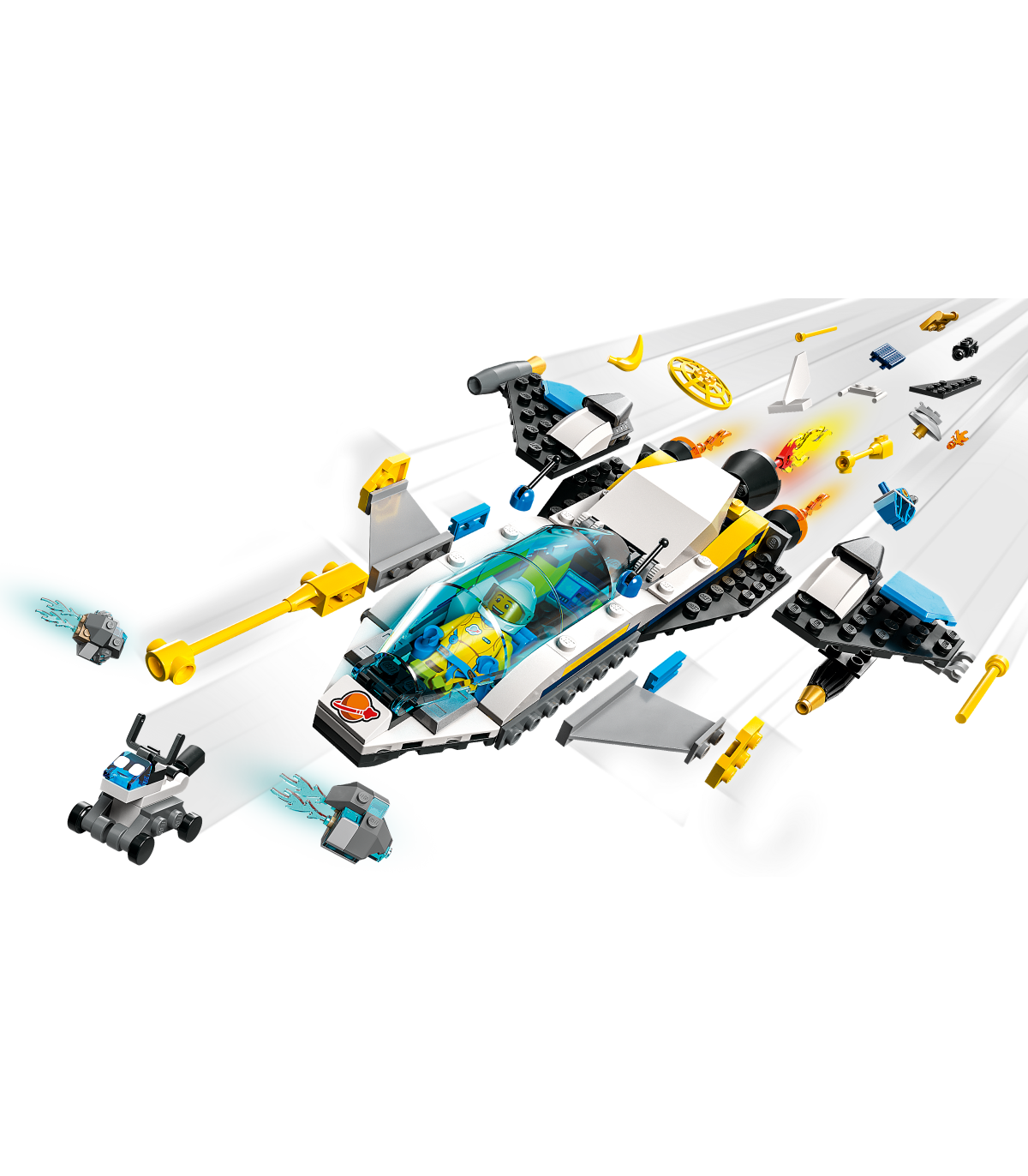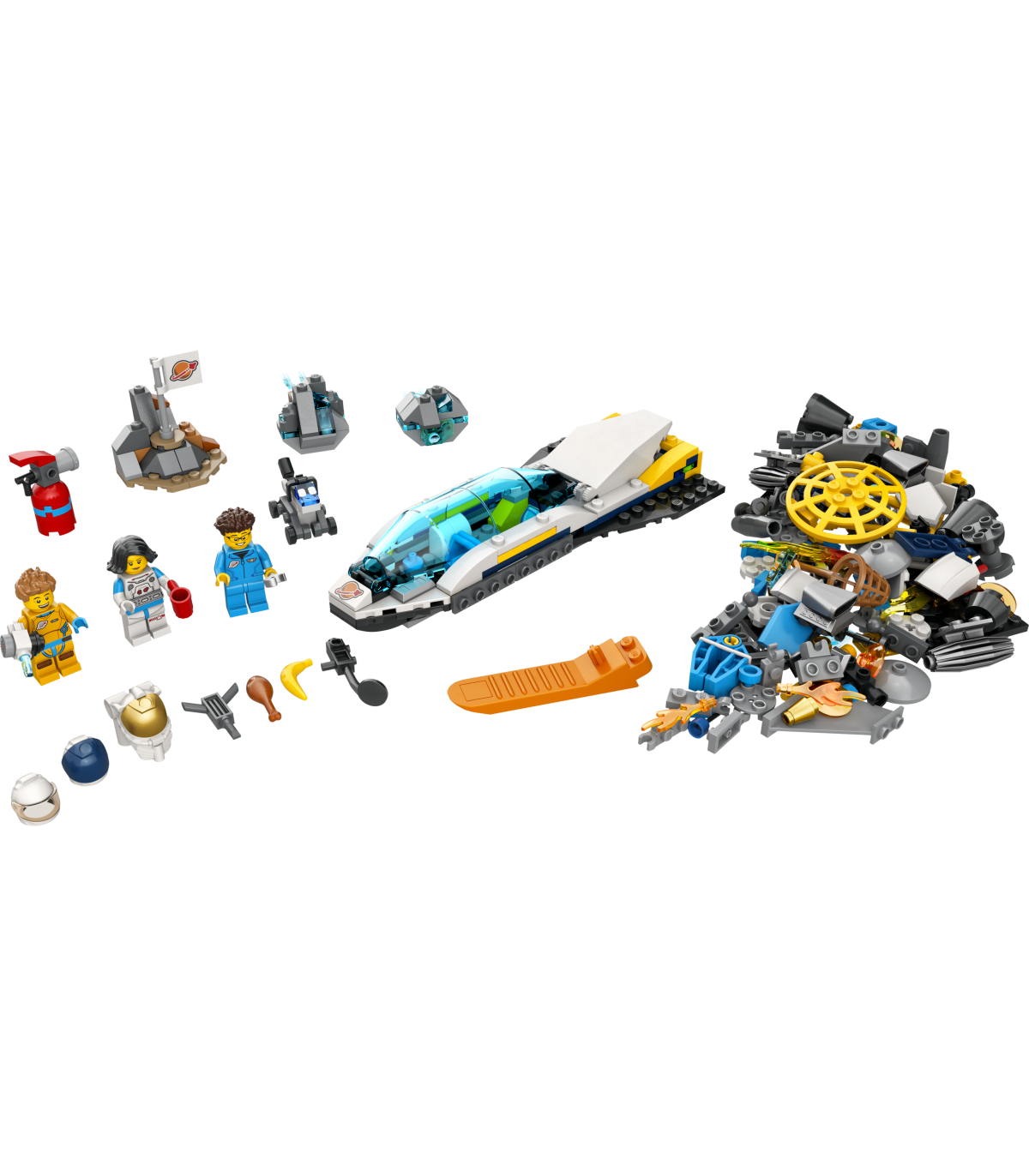• Mis on karbis? – Kõik LEGO® detailid, mida lapsed vajavad missiooniks mõeldud kosmoselaeva ehitamiseks ja juhisteta ehitusülesannete lahendamiseks, lisaks kaks asteroidi, Marsi tegevuspaik, kolm minifiguuri ja robotkoera figuur