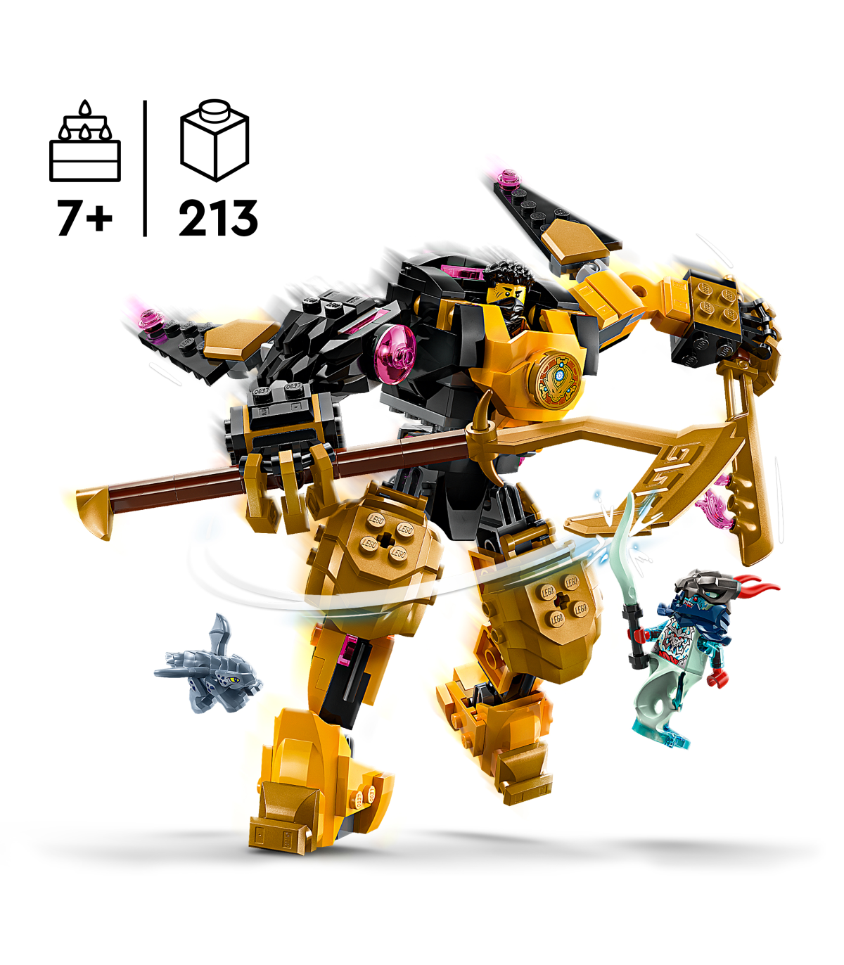 • Mõõdud – selle lastele mõeldud 213-osalise LEGO® NINJAGO® komplekti Arini Spinjitzu lahingurobot on 16 cm kõrge