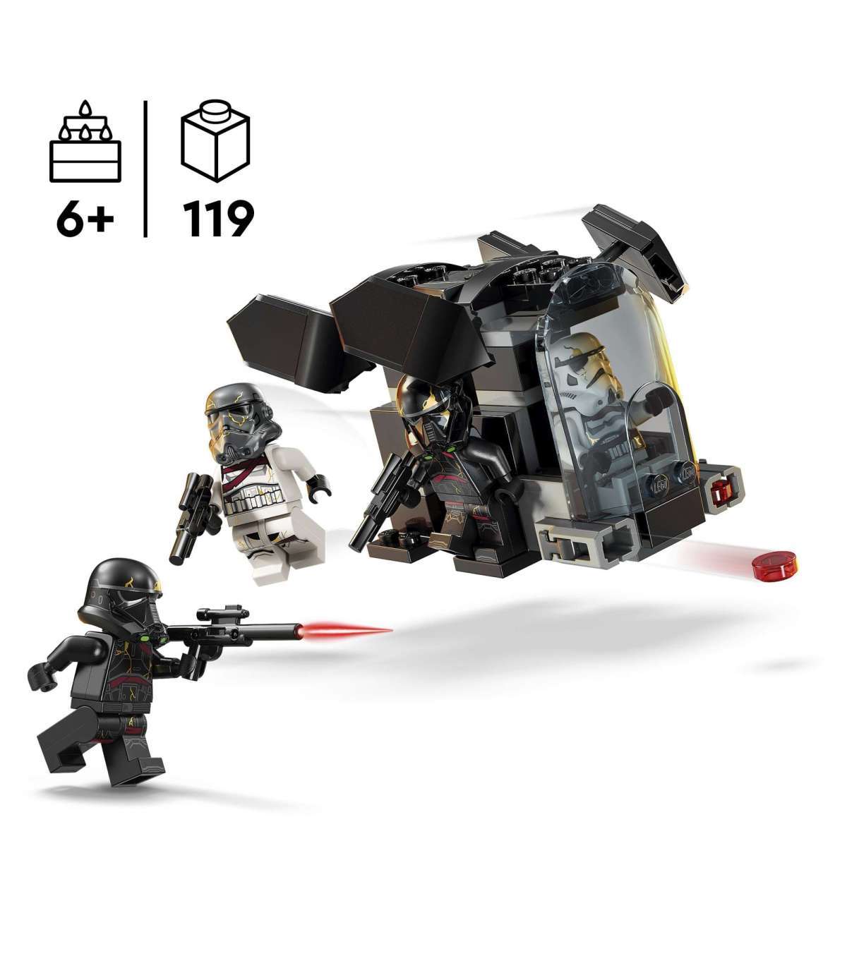 • Death Trooperi ja Night Trooperi lahingukomplekt – transpordi rühma ja mängi Star Wars: Ahsoka™ seiklusi selle lastele mõeldud ehitusmänguasjaga, mis sisaldab LEGO® klotsidest ehitatavat transpordilaeva