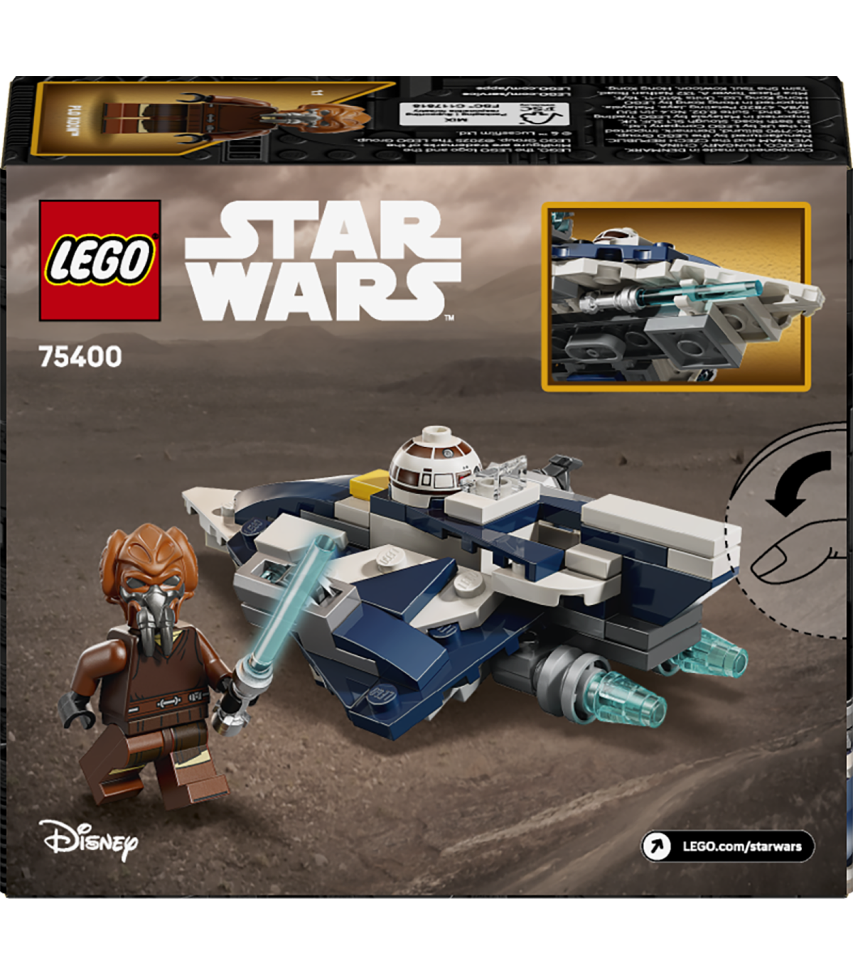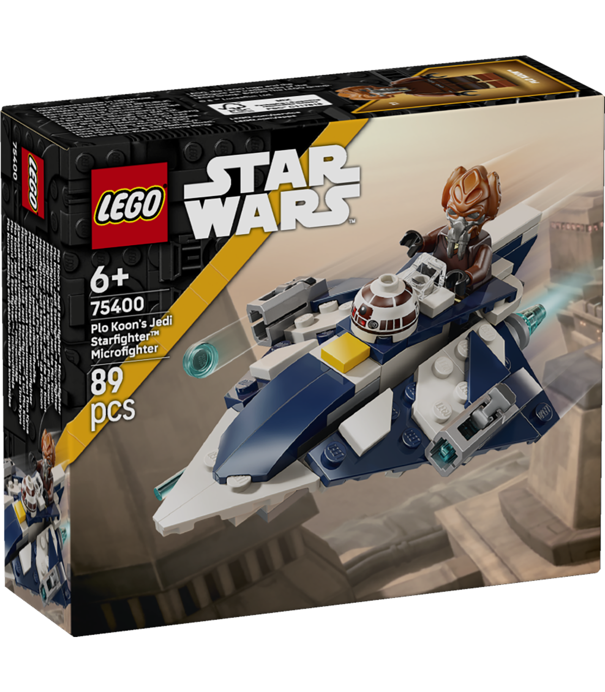 • Kõigi aegade esimene LEGO® Star Wars™ mikrovõitlejate ehitusmudel jedi tähehävitajast – sellel Plo Kooni enda värvides miniatuursel jedi tähehävitajal on kokpit LEGO minifiguurile ja 2 nupsukahurit