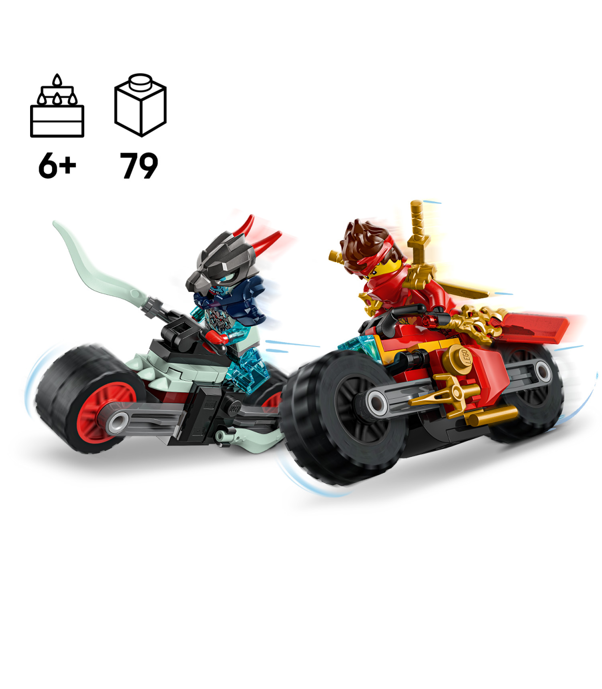 • Mootorrattamänguasi lastele – 6-aastased ja vanemad poisid ja tüdrukud saavad etendada võistlus- ja lahingustseene 3. hooajast sarjast NINJAGO® Dragons Rising selle Kai mootorratta kiirendussõidu mängukomplektiga