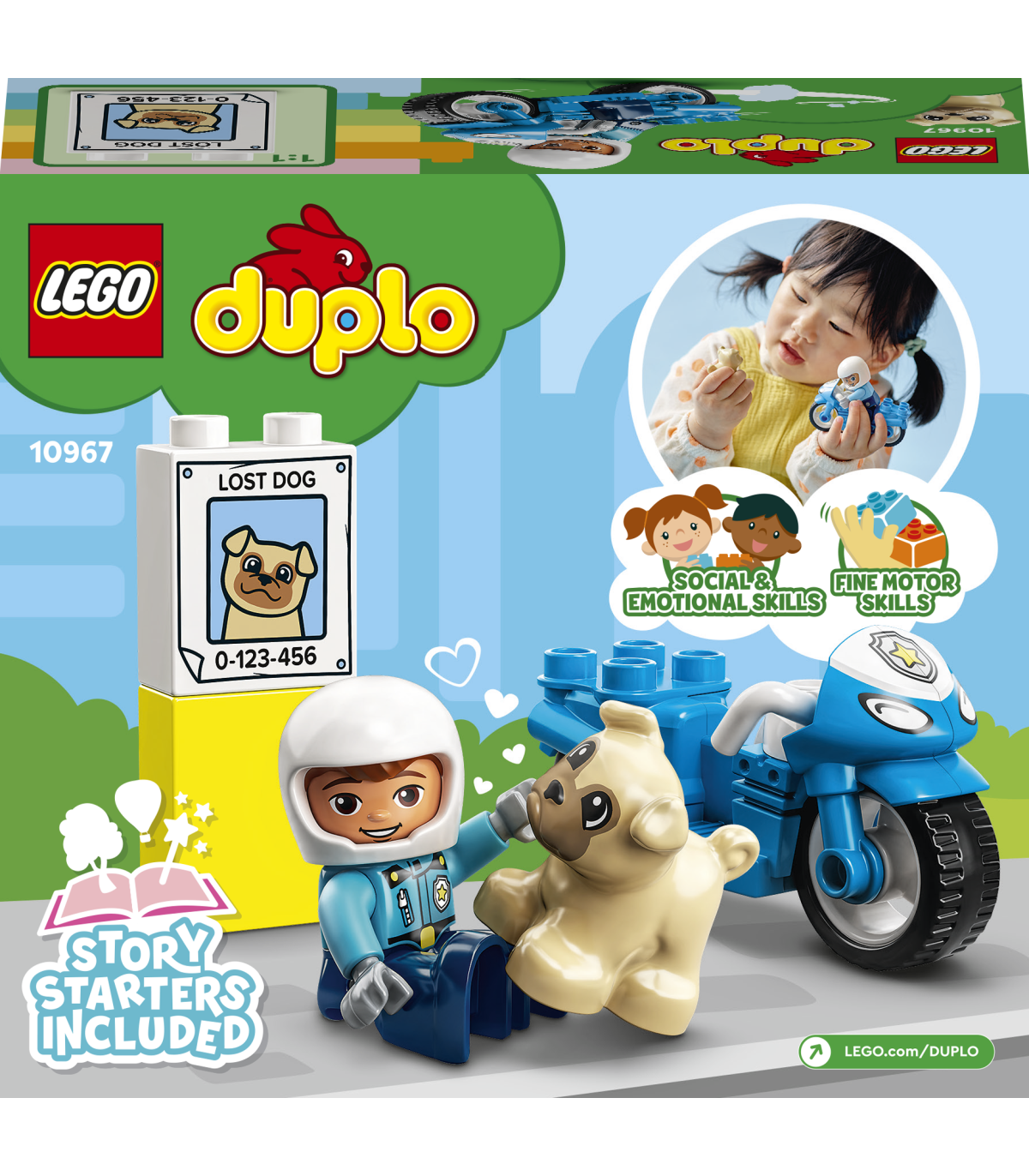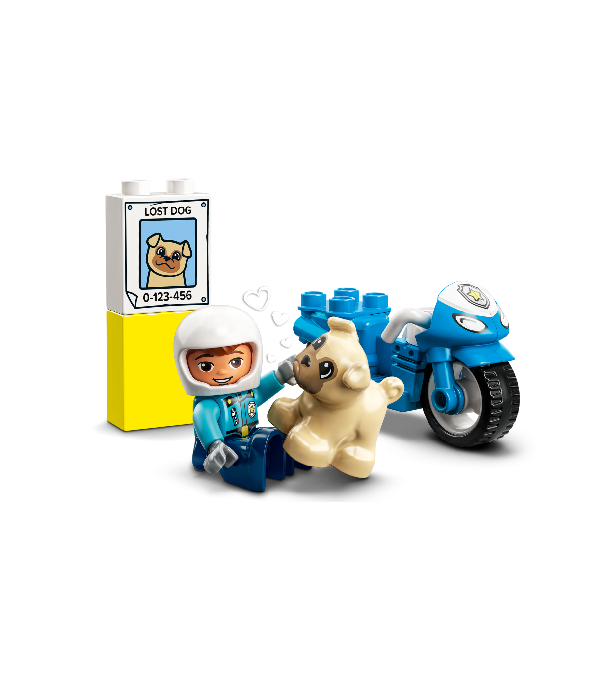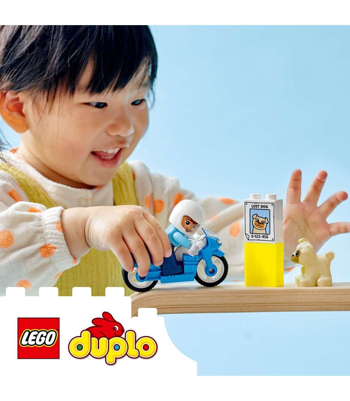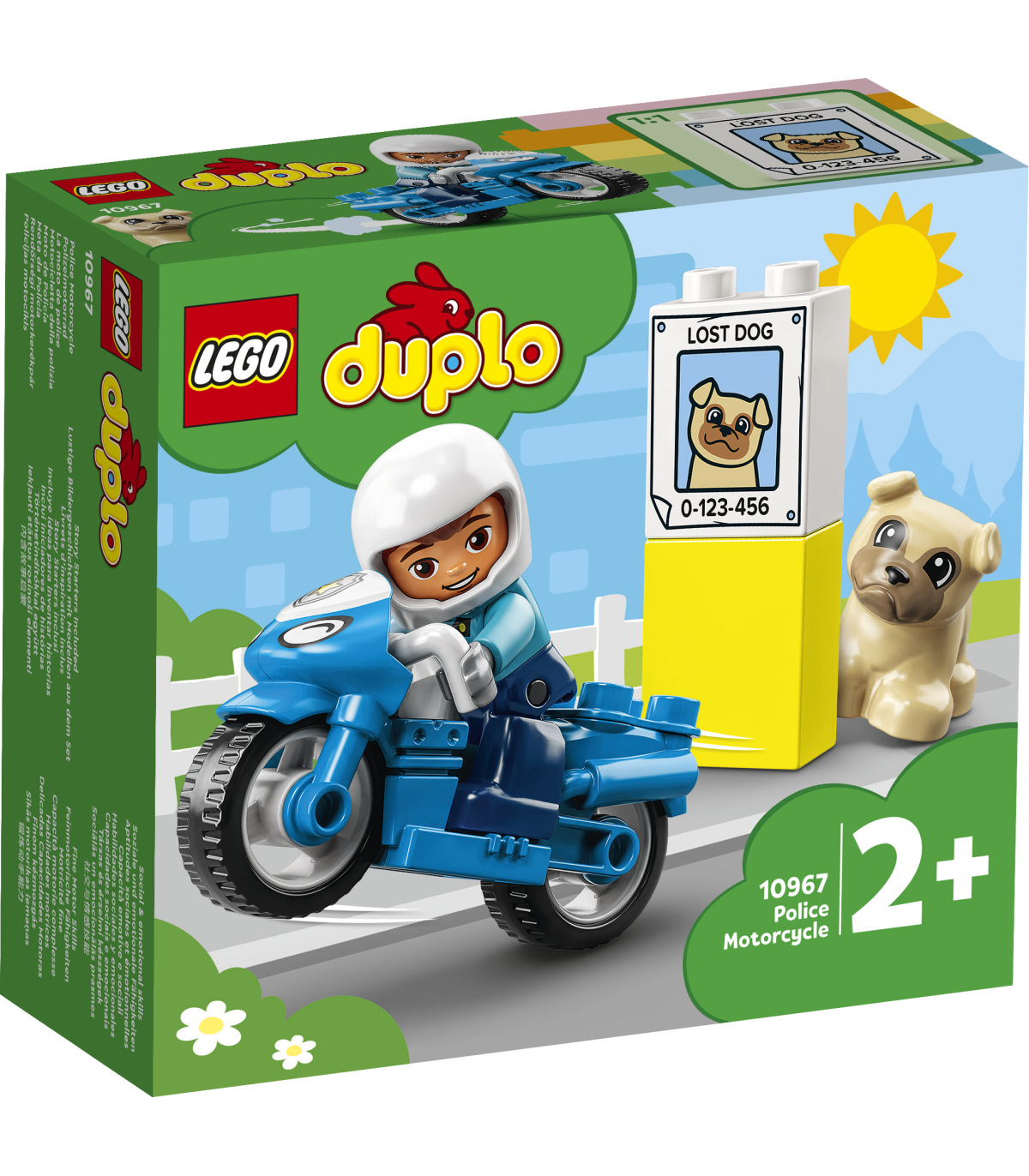 • Innustab loovalt mängima – komplektis on kaks LEGO® DUPLO® figuuri (politseinik ja armas koerake), plakat „Kadunud koer“ ja lisaks lahe sinine politseimootorratas, millega politseinik ja koer saavad sõita