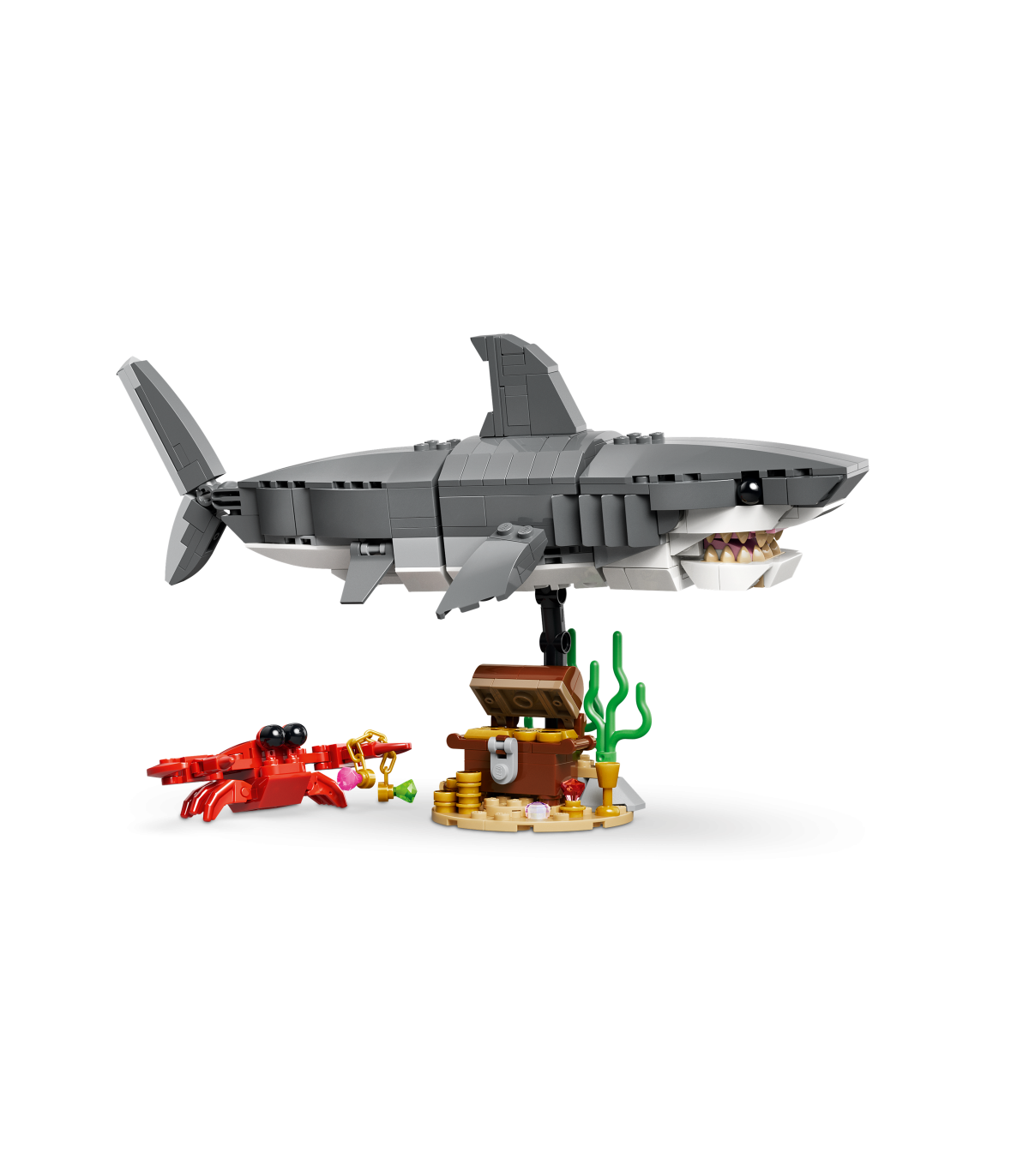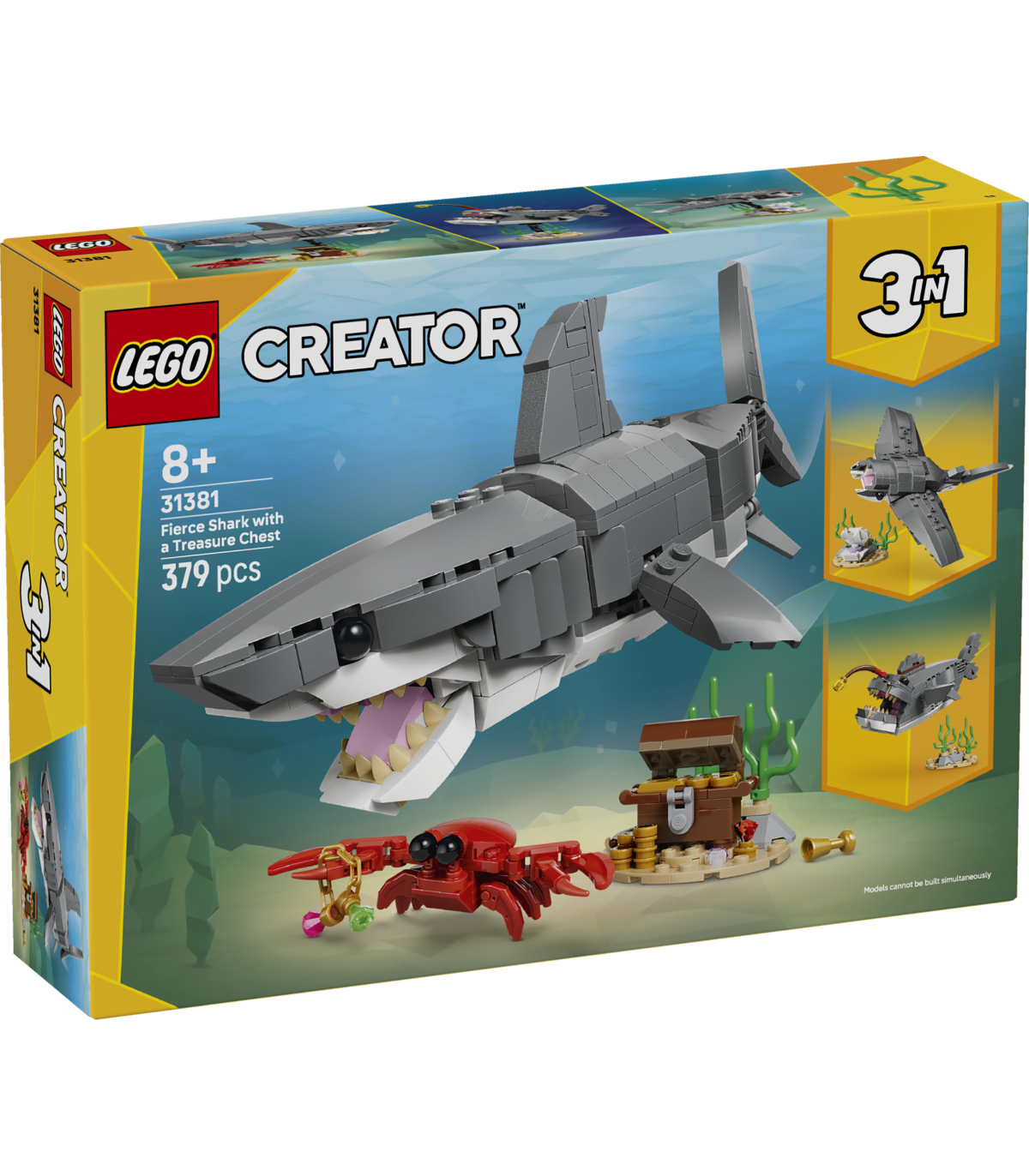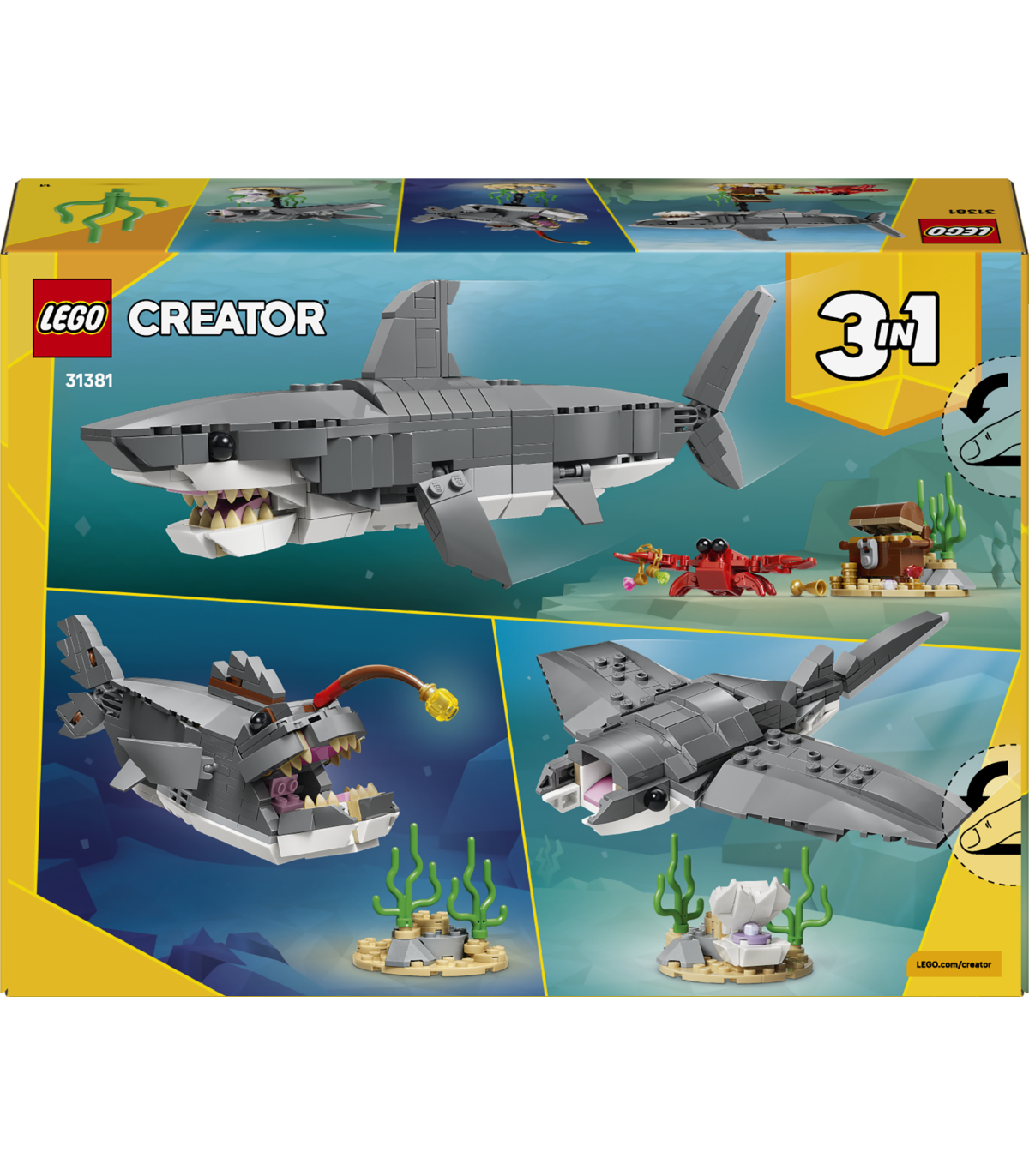 Kolm ühes mereloomad – LEGO® Creator sarja kolm ühes Raevukas hai aardekirstuga (31381) ehitusmänguasi võimaldab alates 8-aastastel poistel ja tüdrukutel ehitada ja ümber ehitada 3 ookeanilooma figuuri samade klotsidega