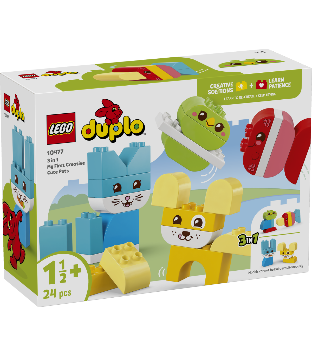 Õppemänguasi väikelastele – Täida mänguajad värvide ja loovusega selle kolm ühes loominguliste armsate lemmikloomade komplektiga (10477), kus väikesed ehitajad saavad värve õppida, luues erinevaid LEGO® DUPLO® loomamänguasju