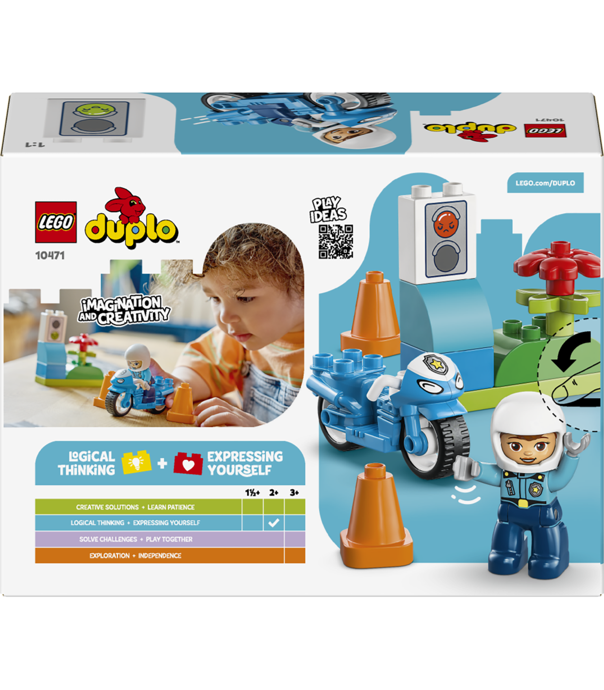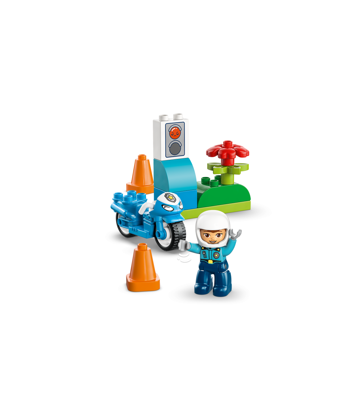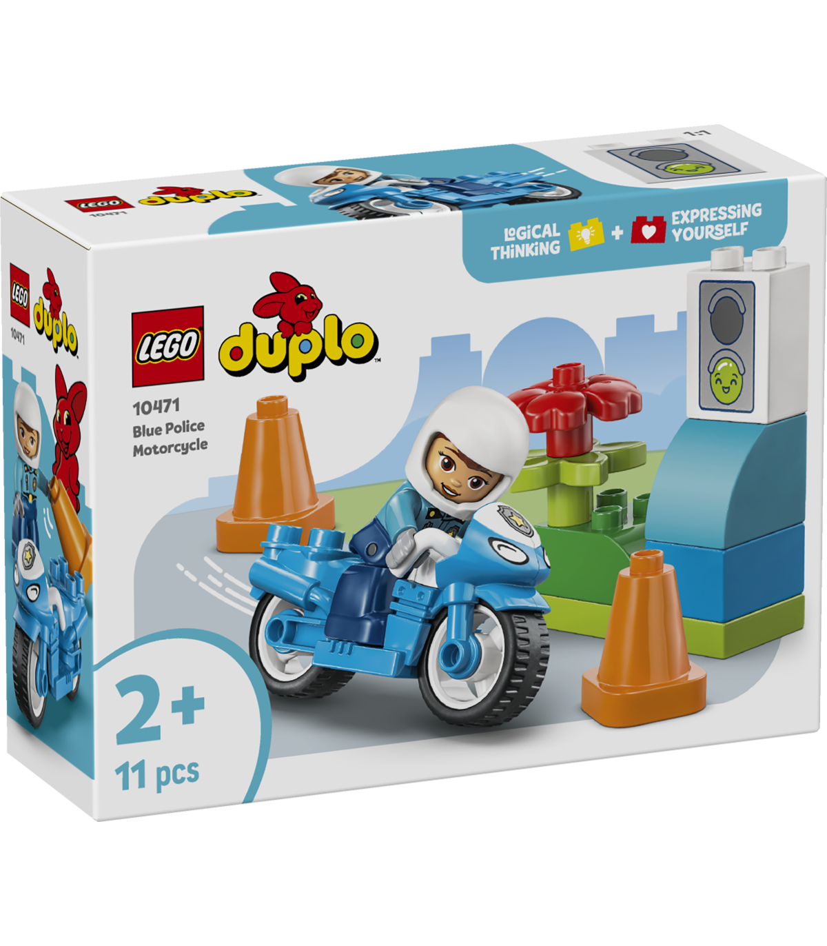 Politsei mängukomplekt – See LEGO® DUPLO® linna sinise politseimootorratta (10471) kingitus võimaldab alates 2-aastastel väikelastel leiutada põnevaid lugusid mootorratta, politseiohvitseri figuuri, liikluskoonuste ja valgusfooridega