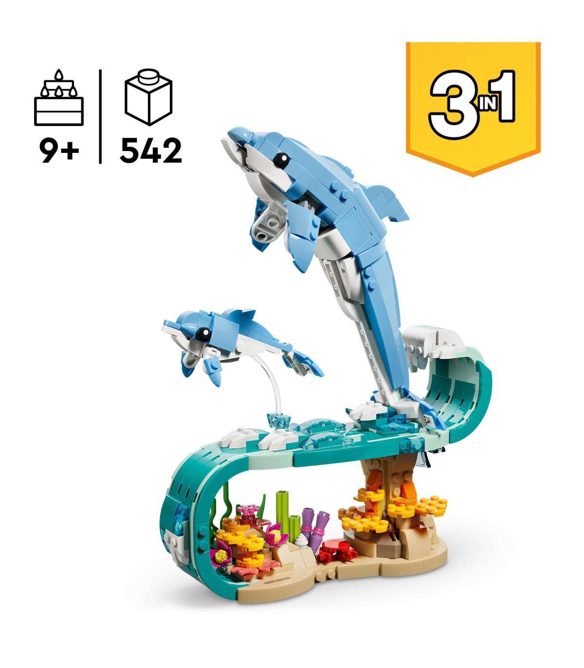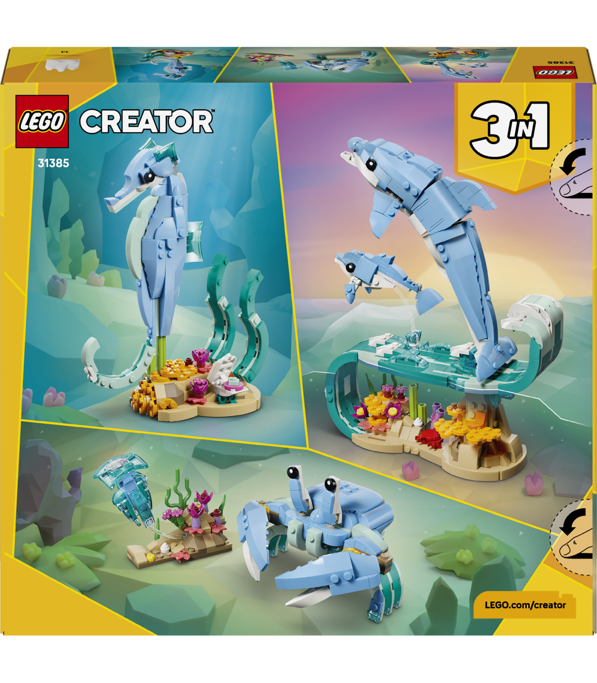 Kolm ühes loomafiguur – LEGO® Creator kolm ühes Mereloomad: ilusad delfiinid (31385) võimaldavad 9-aastastel ja vanematel tüdrukutel, poistel ja lastel ehitada ja ümber ehitada 3 ookeanimänguasja samade klotsidega
