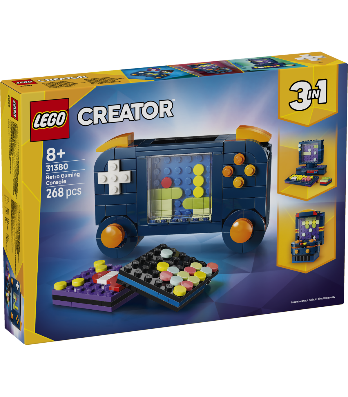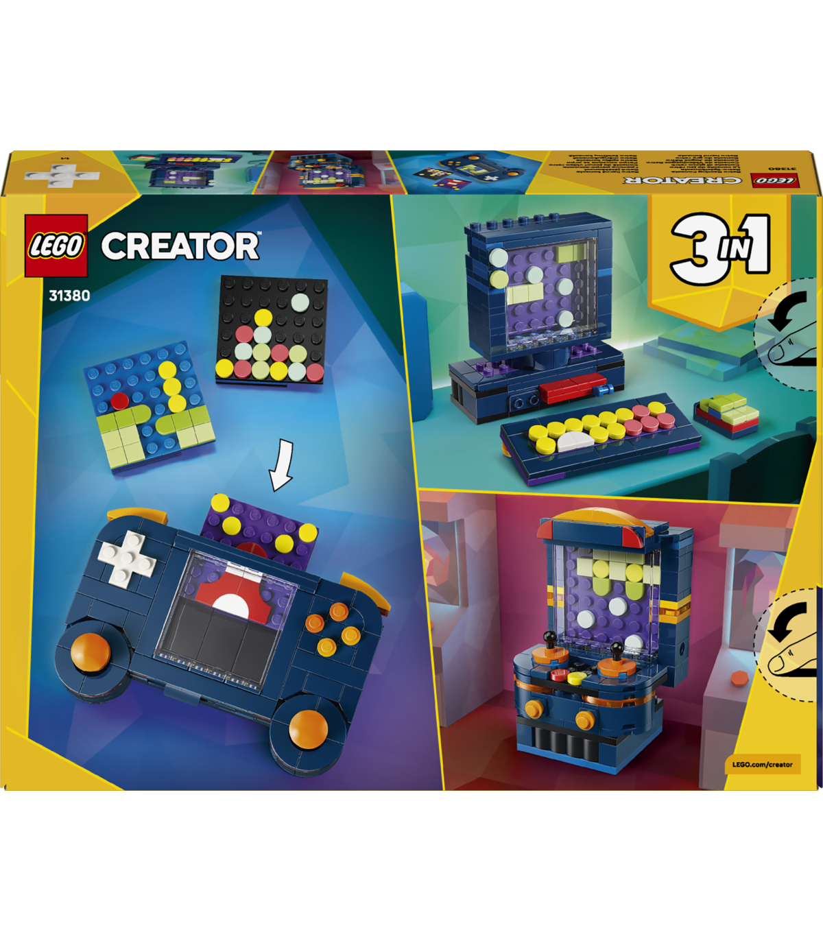Kolm ühes mängutoa kaunistus – LEGO® Creator kolm ühes retro mängukonsooli (31380) ehitusmänguasi võimaldab alates 8-aastastel poistel, tüdrukutel ja mängijatel ehitada ja ümber ehitada 3 erinevat retromänguasja samade klotsidega