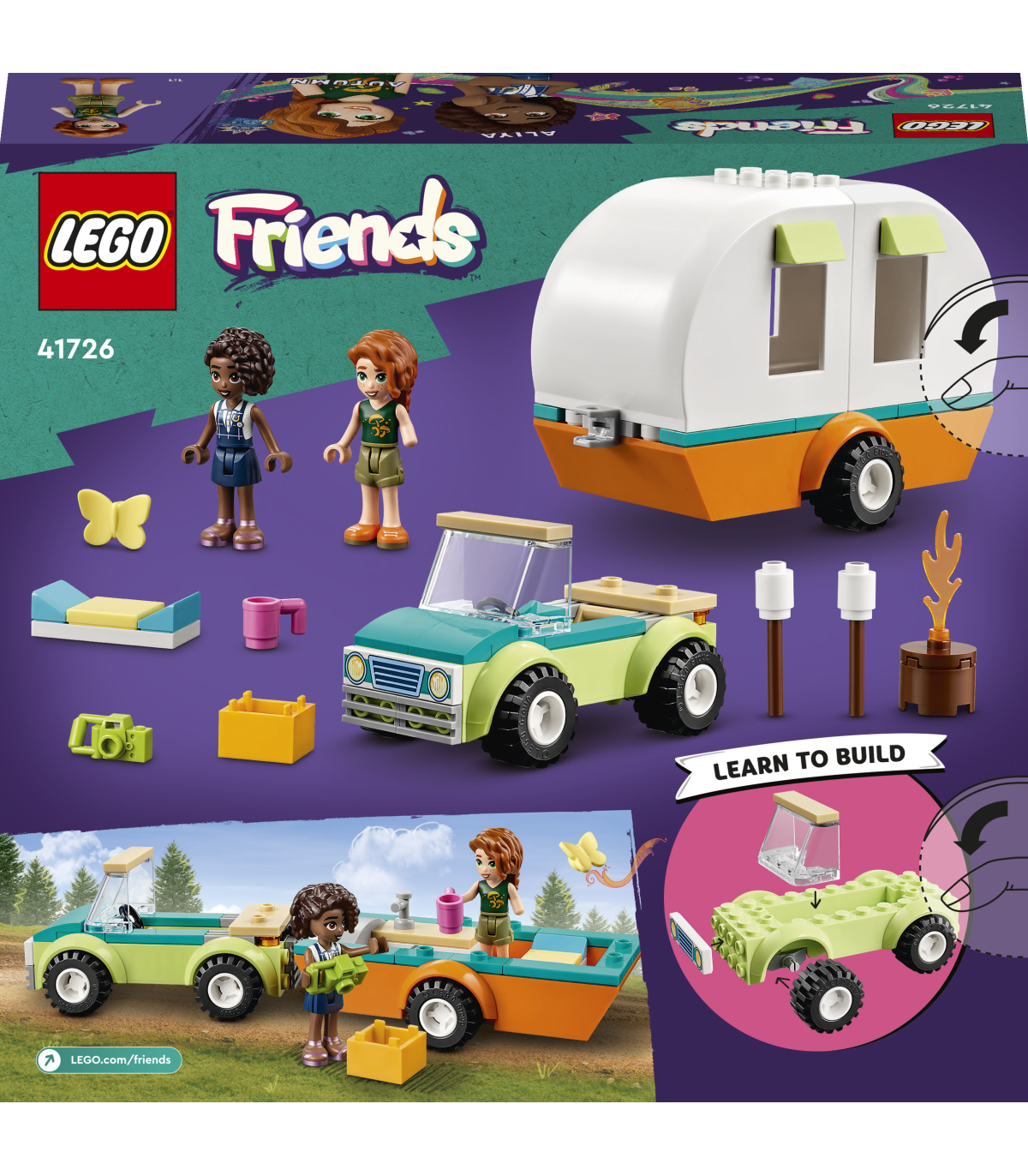 • Komplektis on kaks mininukku – see vahva matkateemaline kingitus sisaldab kaht LEGO® Friends tegelaskuju – loodust armastav Autumn ja linnatüdruk Aliya, lisaks on seal eemaldatava katusega kokkupandav autosuvila
