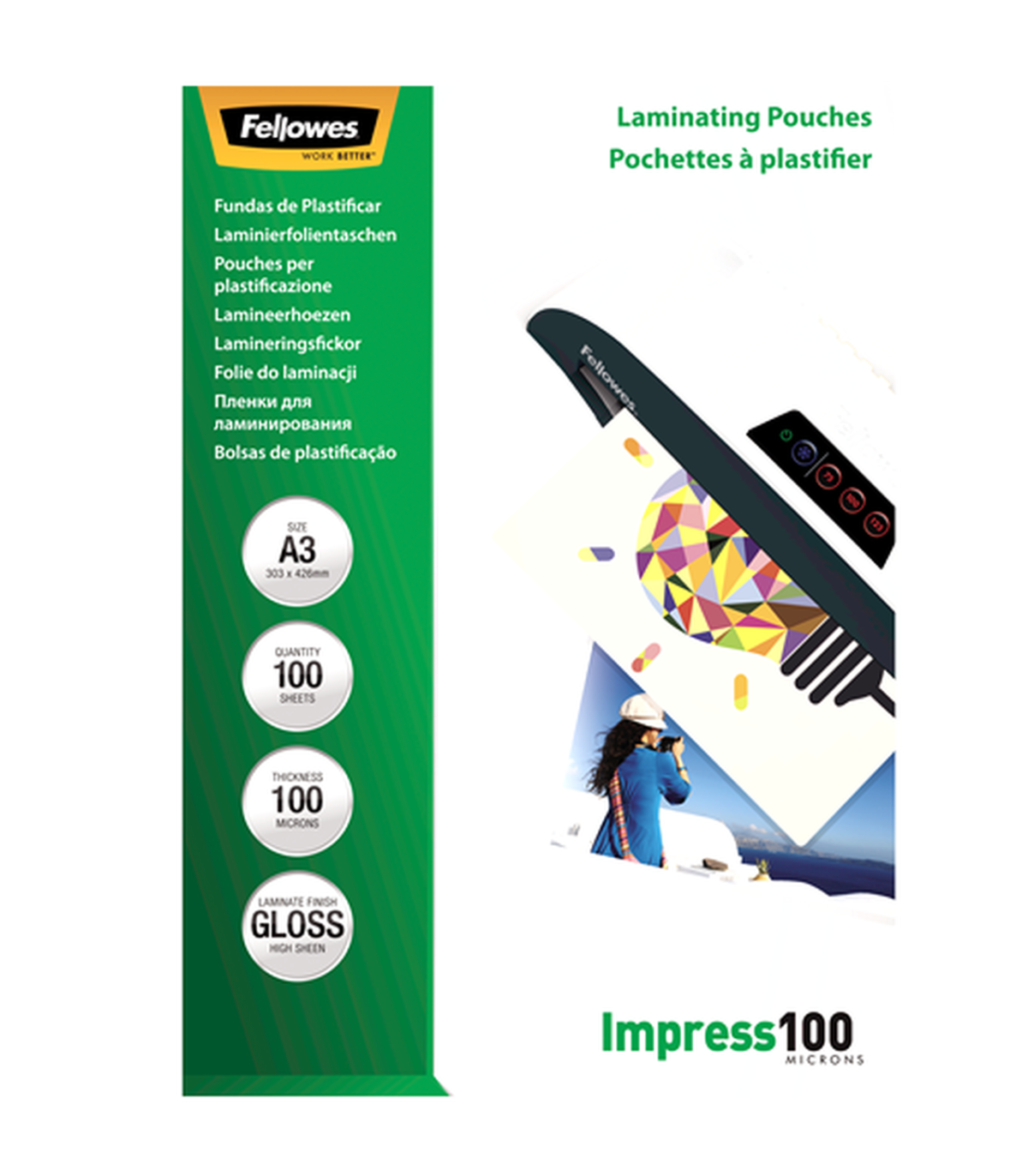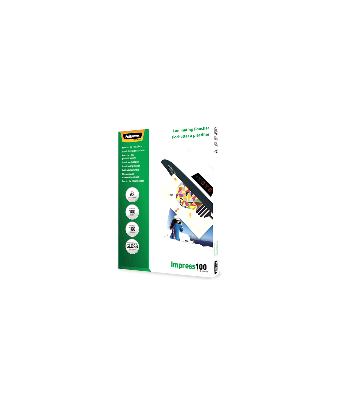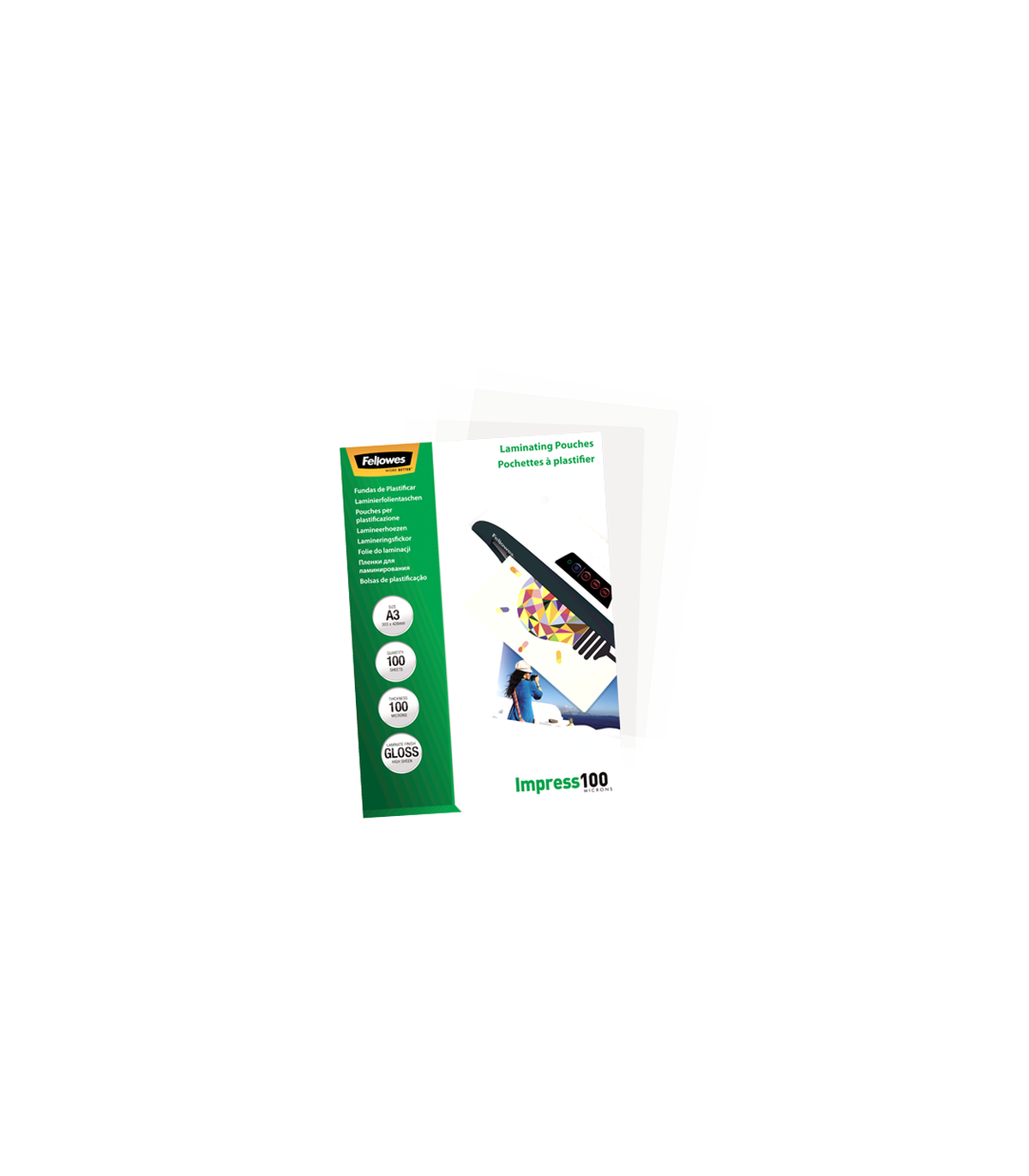 Fellowes | Laminating Pouch | A3 | Glossy | Thickness: 100 micron, Qty Per Pack: 100 pcs; Ideal for notices, craft materials, signage and frequently handled documents; Compatible with all laminator brands