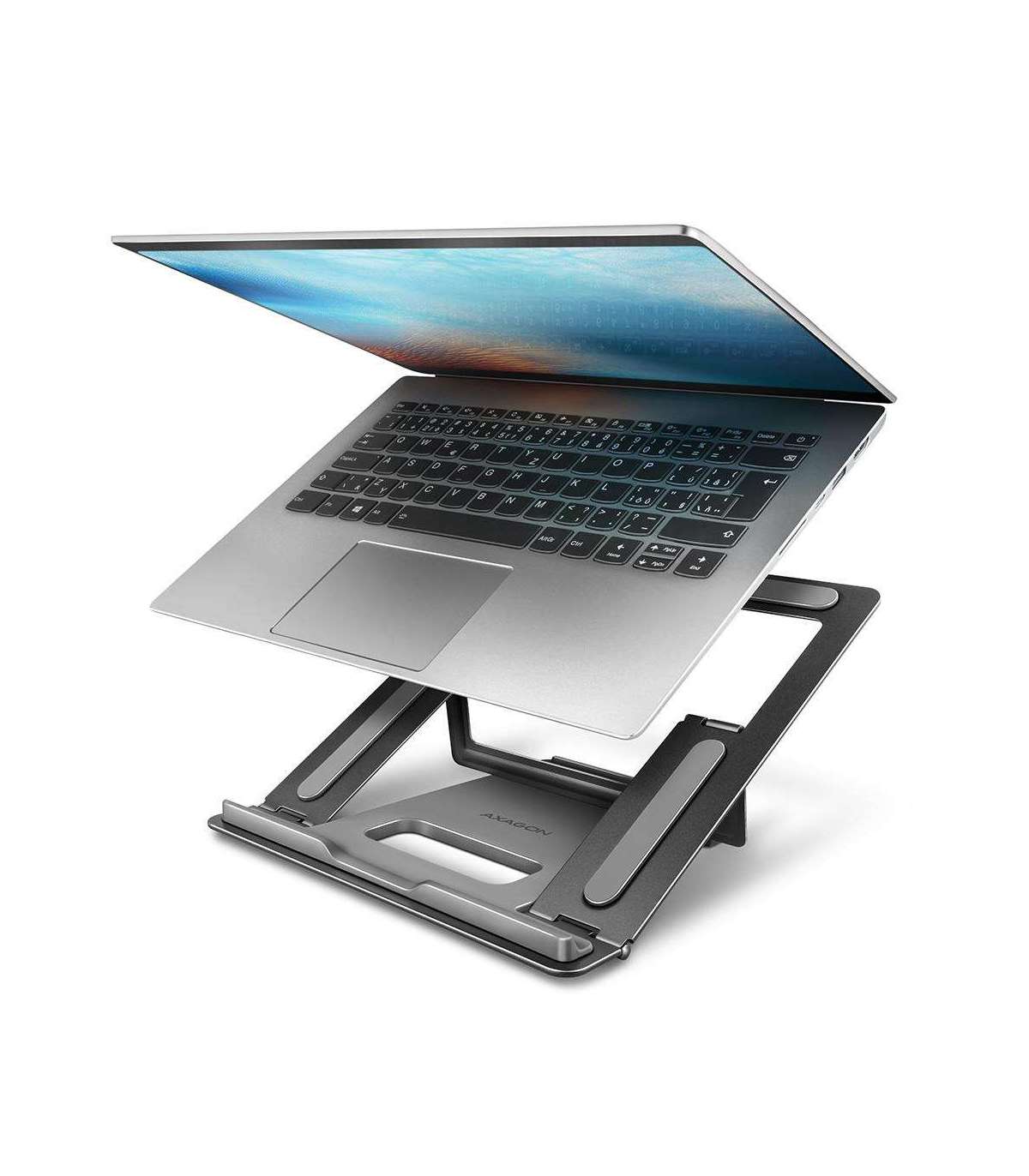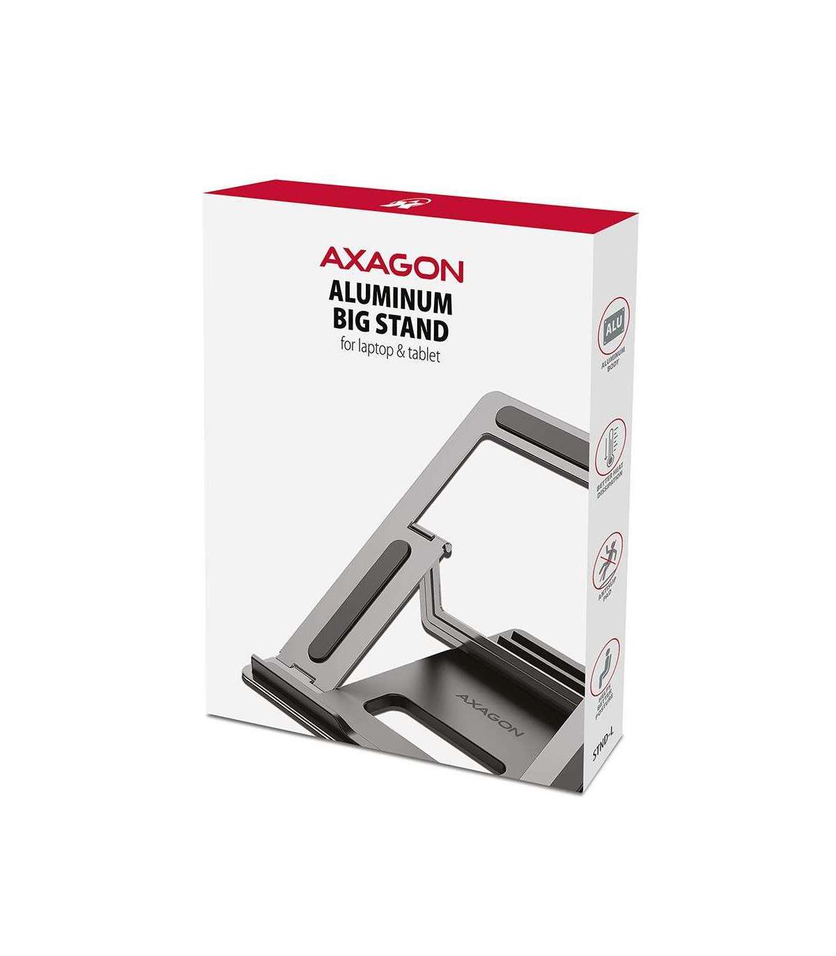 AXAGON STND-L is a foldable notebook or tablet stand that relieves your neck and back muscles when working on a computer. The stand has a universal use for devices from 10" up to 16". Four adjustable positions allow for better ergonomics.