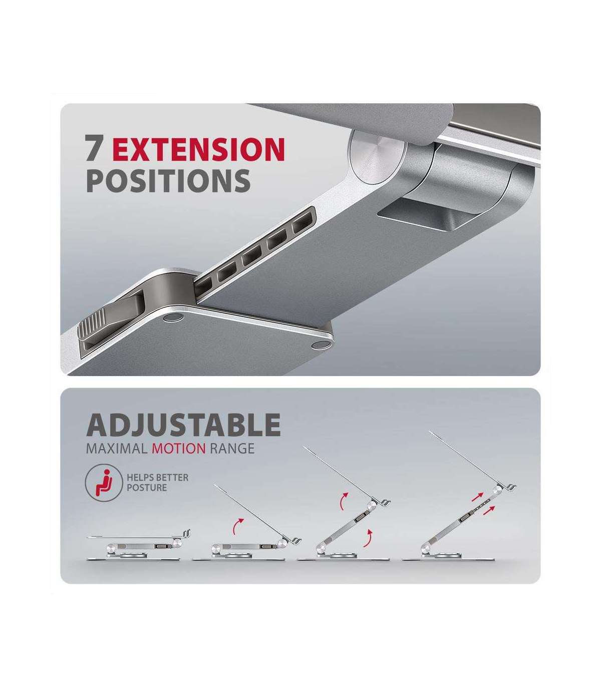 A unique feature is the extendable arm with anti-release lock, which allows it to be extended by up to 6 cm thanks to seven adjustable positions. This makes it easy to adjust the laptop to the optimal height and distance from your eyes to suit your needs. The clever double-hinge solution provides smooth adjustment of the screen height to be flush with your external monitor. This gives you an additional workspace at the correct eye level, greatly improving ergonomics, increasing comfort and boosting your productivity.