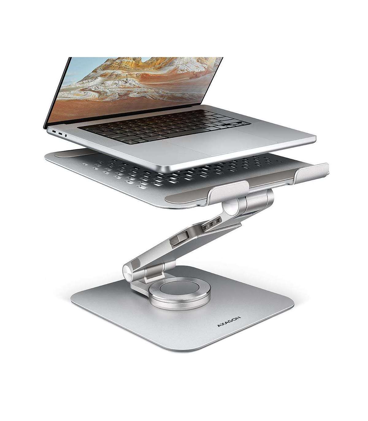 Aluminum stand with 360° rotation for laptops 10" - 17.3". Adjustable height and angle.