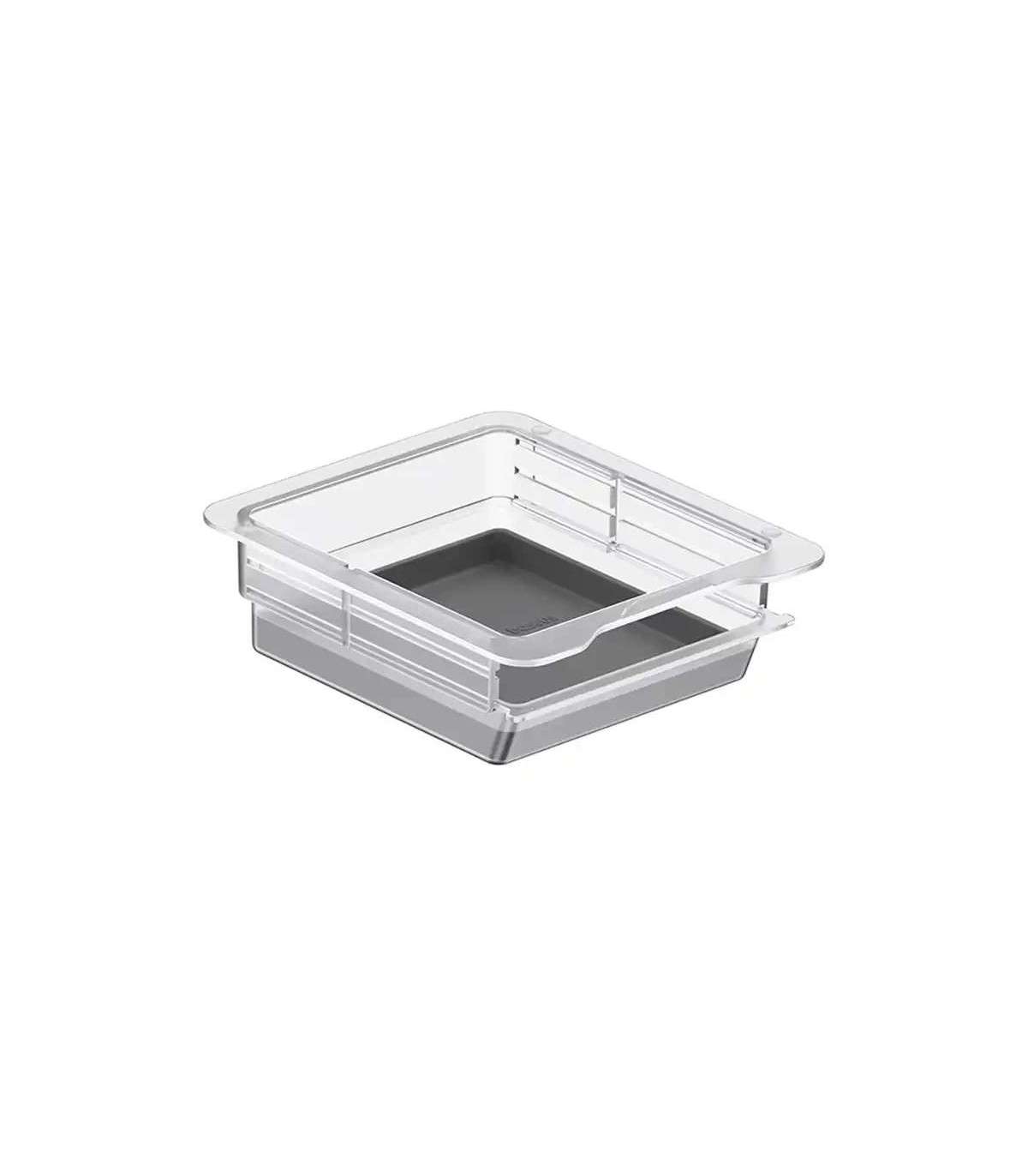 The container is very straightforward and non-invasive to install - simply slide it into the compartment and it’s ready to go. What's more, to access items in the deeper part of the chamber, you only have to slide it forward as if you were closing a drawer. The container is made of FGS (Food Grade Silicone), a very durable silicone that withstands wear and high temperatures - it is also odorless, doesn’t collect dust, and cushions and silences items moving within it. If the need arises, it is very easy to clean.