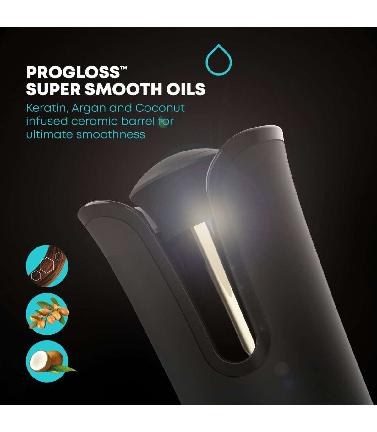 Keraamiline ja ioonne tünn, mis on infundeeritud Progloss™ ülisileda keratiini, argaania- ja kookosõliga