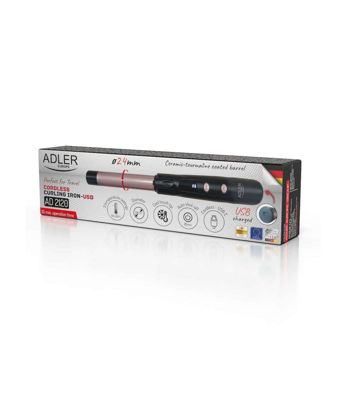 Ceramic-tourmaline coated barrel; Memory function of the last temperature setting; Automatic shutdown after 20 minutes; Overheating protection; Charging time: up to 3 hours