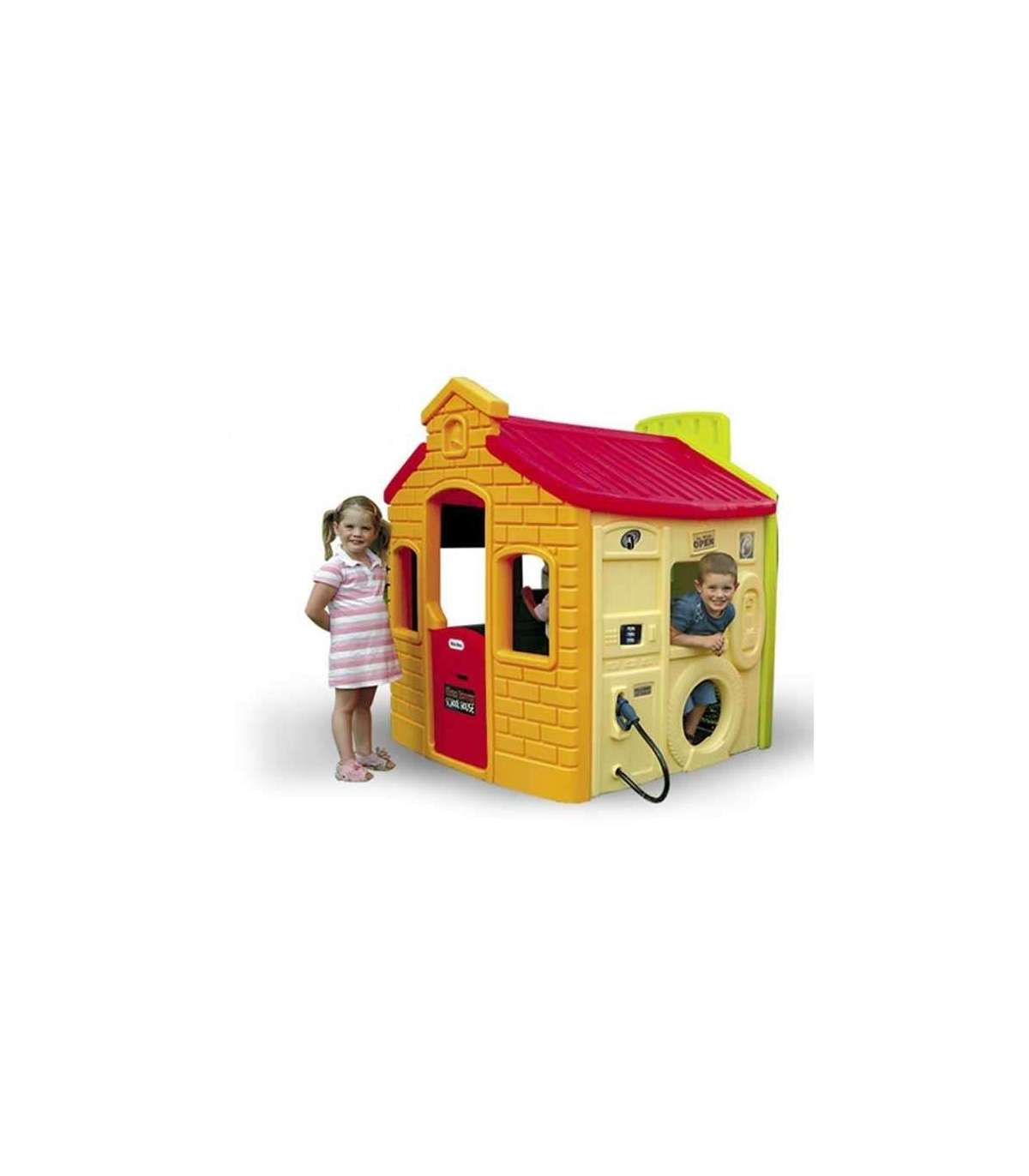Plastikowy ogrodowy domek amerykańskiej firmy Little Tikes oferuje niekończącą się interaktywną zabawę. Cztery różnorodne motywy umieszczone na ścianach domku pobudzą do kreatywnej i pełnej fantazji zabawy. Ściana z motywami sportowymi wyposażona jest w obręcz, piłkę oraz tarczę do rzucania piłek. Ściana ze stacją benzynową wyposażona jest w dystrybutor paliwa, telefon oraz specjalnie wyprofilowane detale. Ściana ze sklepem spożywczym / barem szybkiej obsługi posiada podjazd pod okienko z okiennicami, kasę, półkę wewnątrz domu oraz wyprofilowane akcesoria. Szkoła wyposażona jest w stolik, tablicę, alfabet oraz cyferki. Te domki plastikowe mają wnętrze wyposażone w kuchenkę, warsztat i kasę dopasowuje się do stylu zabawy. Domek ma podwójne ściany, dzięki czemu jest chroniony przed szkodliwym wpływem słońca i warunków atmosferycznych, a także jest odporny na gwałtowne uderzenia.