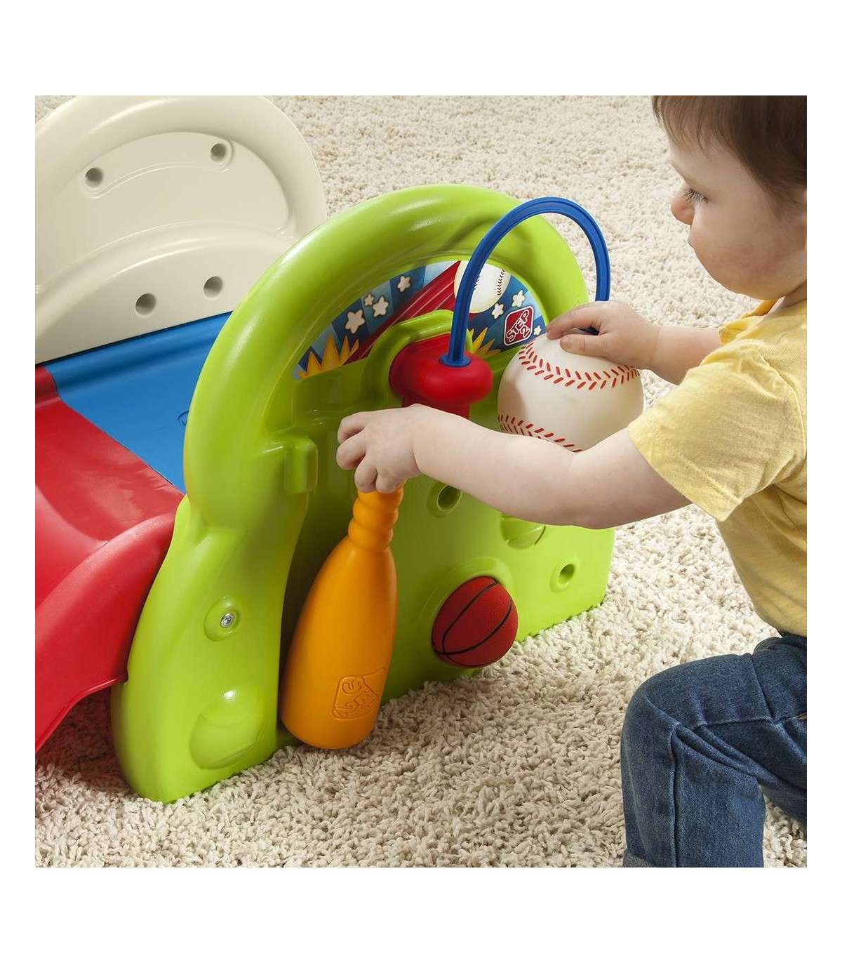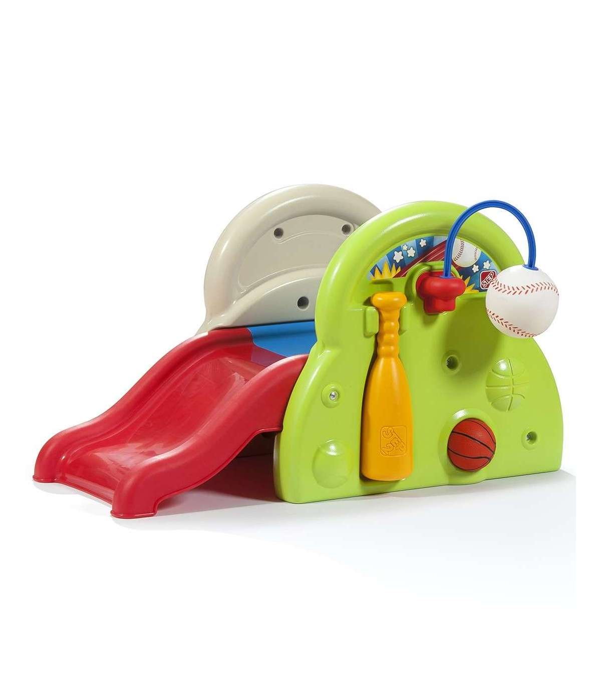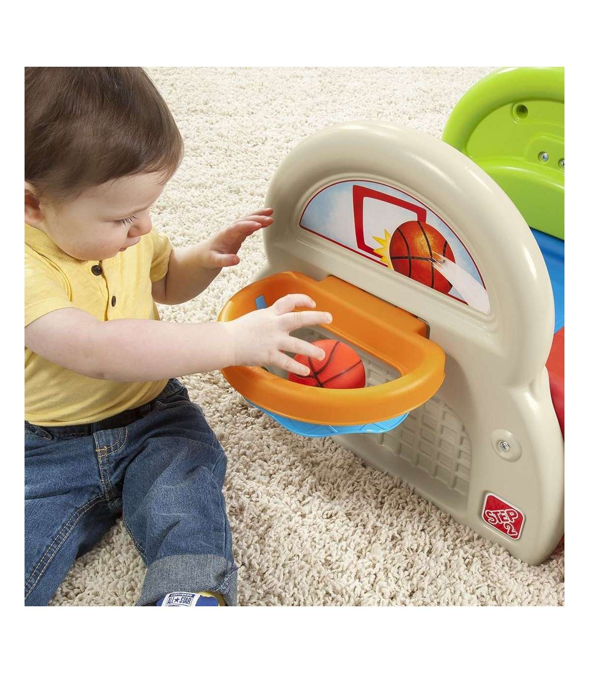 Mänguväljak firmalt STEP2 pakub palju mänguvõimalusi. Selles kaasahaaravas aktiivsuslinnakus väikestele lastele on peamiselt sporditeema. Lapsed saavad harjutada tasakaalu ja motoorikat, ronides väga laiast astmest ja liugledes teisel pool liumäge. Seal on ka pall ja korvirõngas, mis võimaldavad lapsel visata eesmärki. Lisaks võib kasutada kaasaantud kepi, et lüüa kinnitatud pesapallipalli! Tänu sellele väikelastele mõeldud spordimänguasjale hüppab su väike põngerjas koju, libiseb baasi ja teeb mängides hämmastavaid pealtviskeid. Kui mäng on läbi, kasuta sisseehitatud hoiukohta, et korvpall ära paigutada, ning suru kepp aktiivsuskeskuse välisseina külge, et kõik oleks järgmiseks mängupäevaks käepärast.