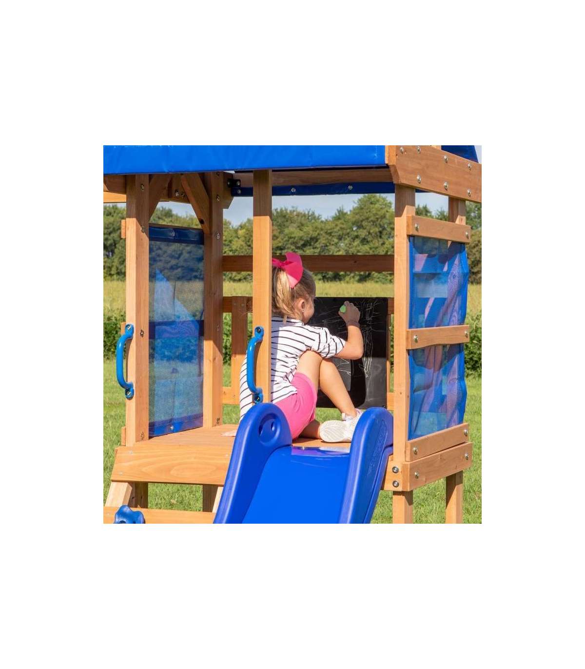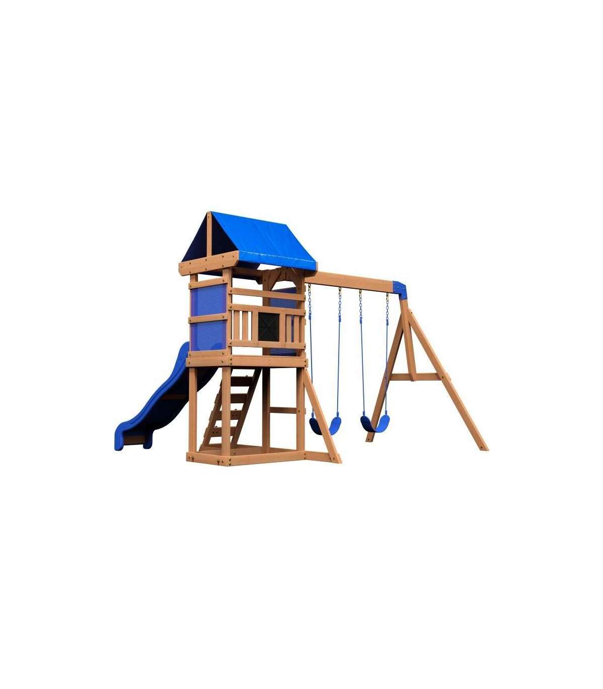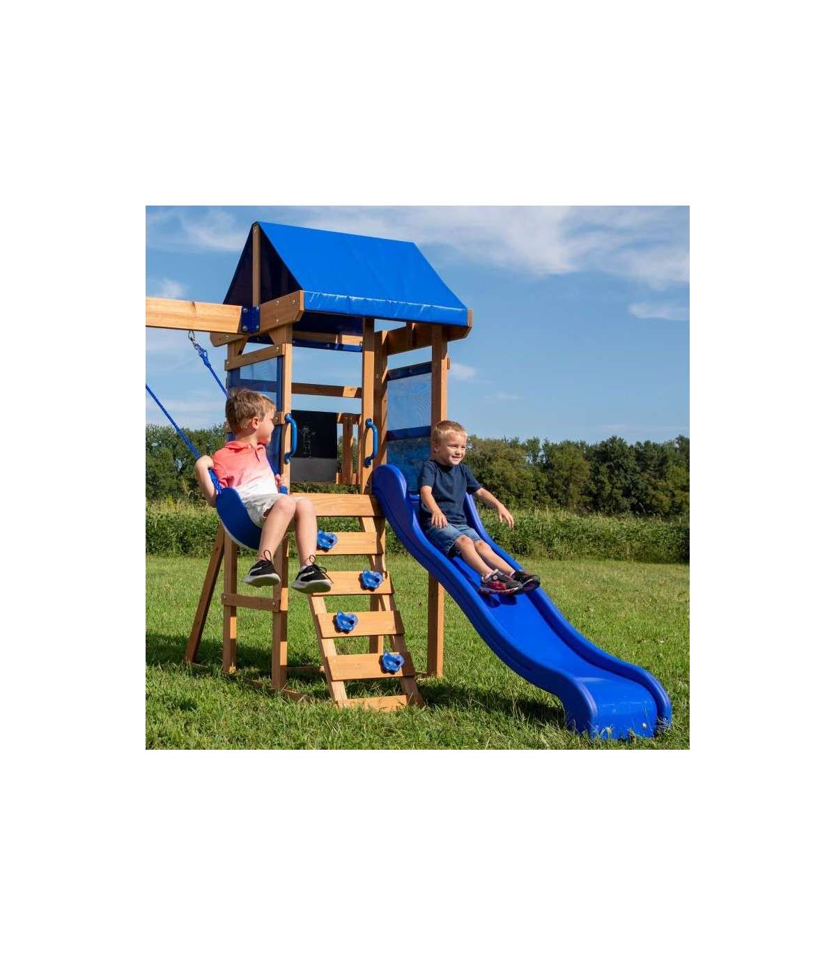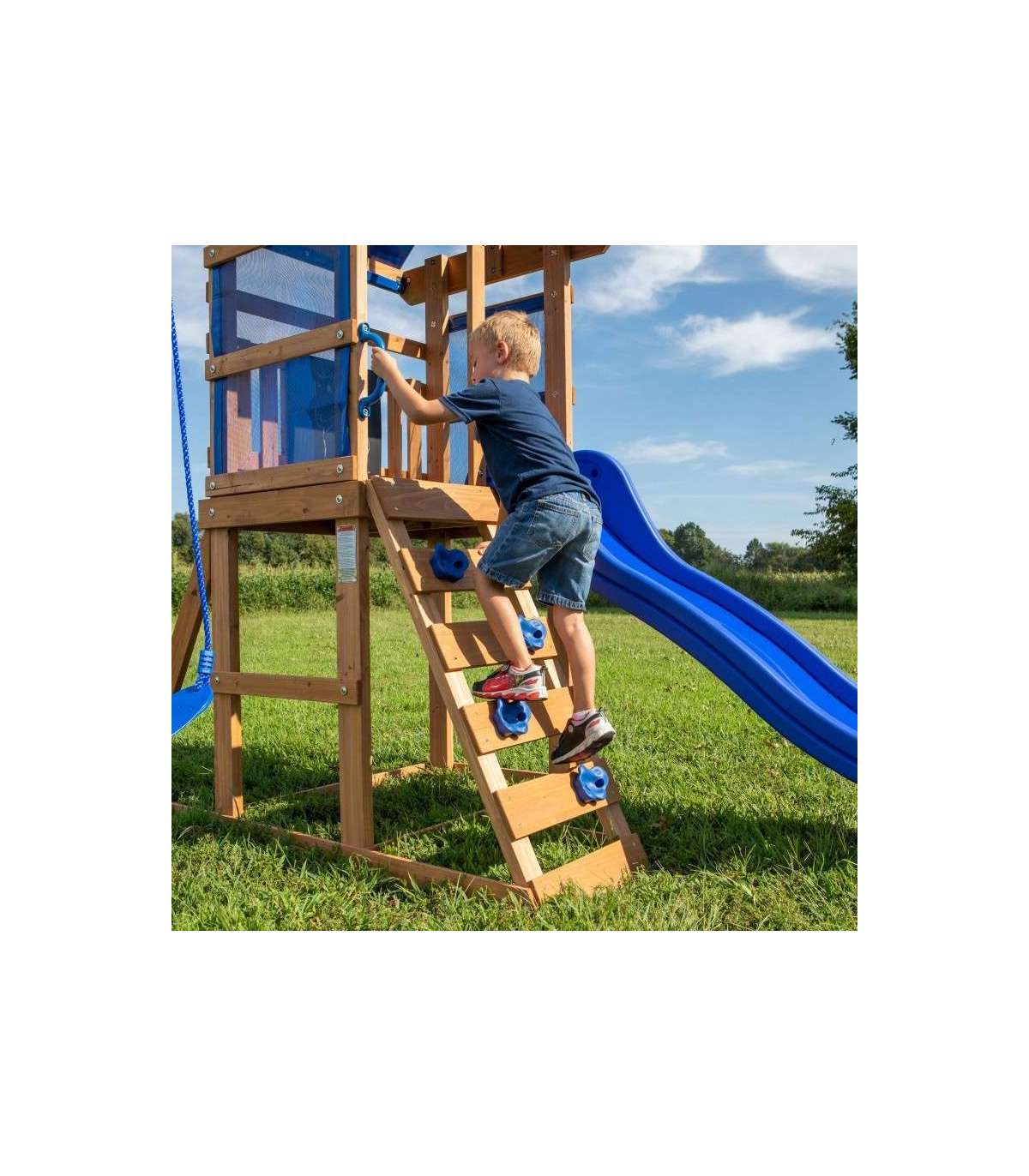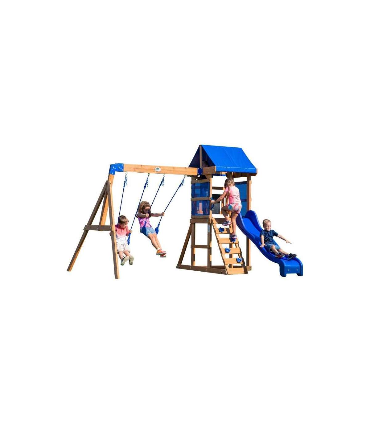 Aurora Backyard Discovery mänguväljak on suurepärane valik ka väiksematele aedadele. Aias mängimine ei muutu kunagi enam igavaks! Puidust mänguväljak Aurora pakub palju mänguvõimalusi. Siit leiab platvormi lainelise sinise liuguriga, millele pääseb turvalise redeli kaudu, mis toimib ka ronimisseinana. Kõike katab sinine katus, mis pakub lapsele varju päikese eest. Alumises osas on liivakast ja kaks tugevat kiike.
