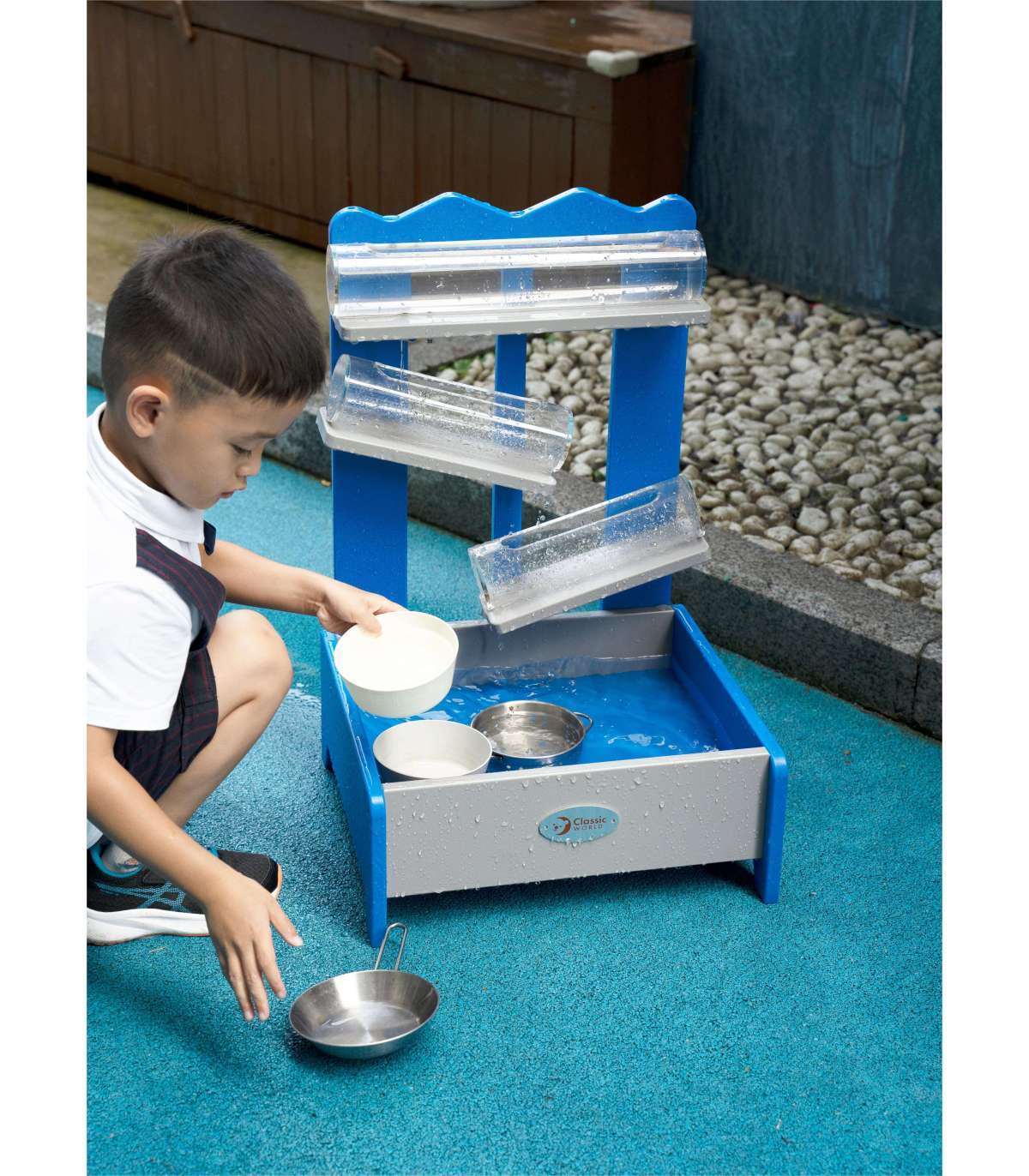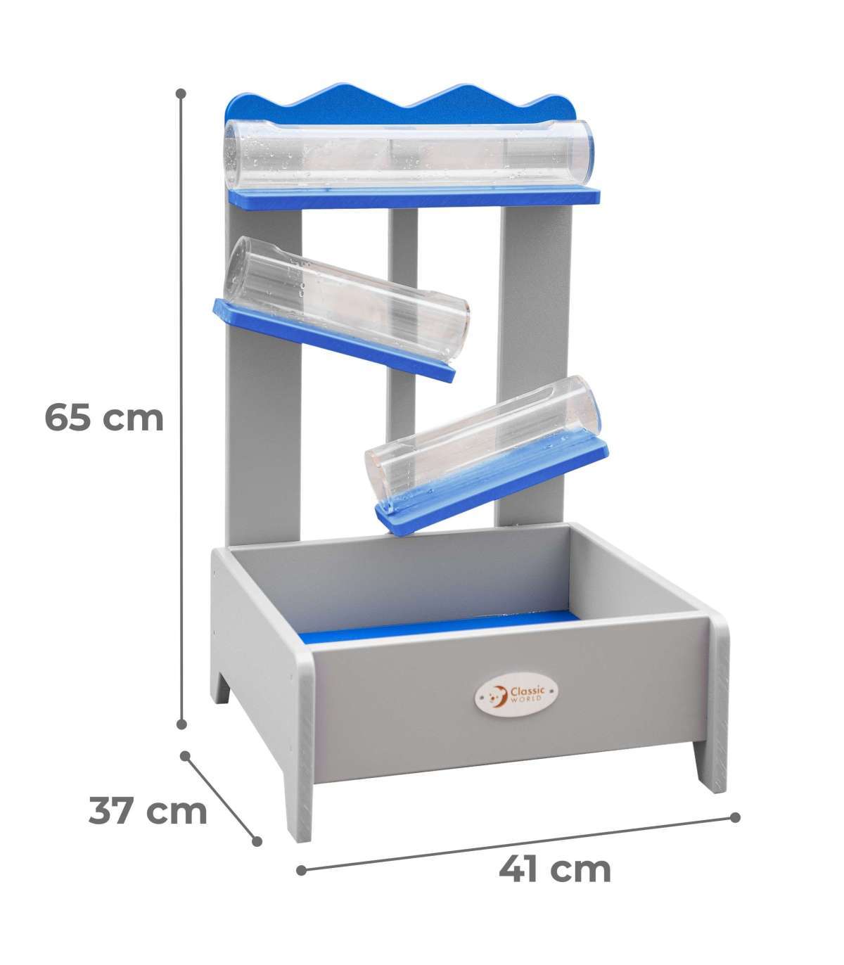 Vee mänguasi lastele tuntud brändilt Classic World on suurepärane katsekomplekt teie lapse liivakasti, aga ka haridusasutuste jaoks. Täitke lihtsalt renn veega ja vaadake, kuidas läbi väikese ava vesi ühest teiseni voolab, moodustades mini-basseini. Vesi tilgub ülevalt läbipaistvast torust ja voolab mööda kahte ülejäänud toru. See tegevus aitab arendada laste arusaamist vee, liiva või pallide voolavusest.