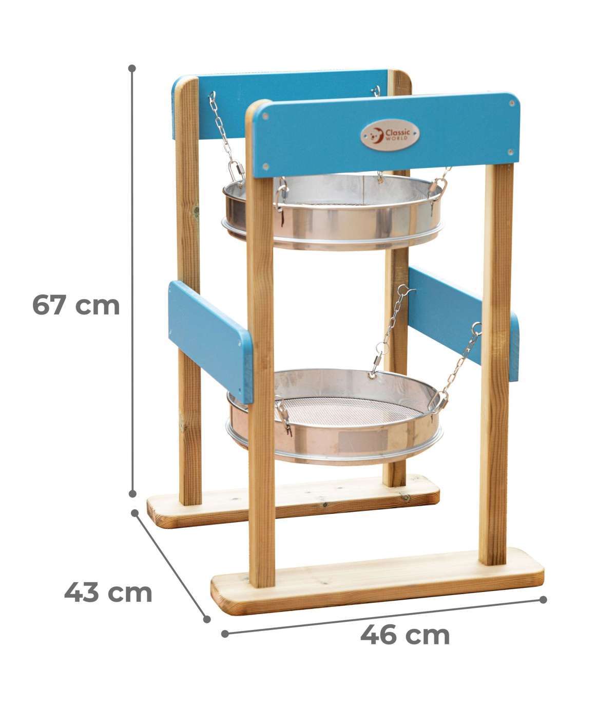 Puidust topeltsõel brändilt CLASSIC WORLD on suurepärase kvaliteediga liivamänguasi, mis on ideaalseks täienduseks sinu liivakastile. Mänguasi sobib suurepäraselt ka mänguväljakule ja haridusasutustesse. Tänu kõrgele kvaliteedile teenib mänguasi sinu last väga kaua. Sõeladel on suur pindala, mis võimaldab lastel liiva nendest läbi sõeluda, aga ka paigutada nende peale kive — piiriks on vaid fantaasia!