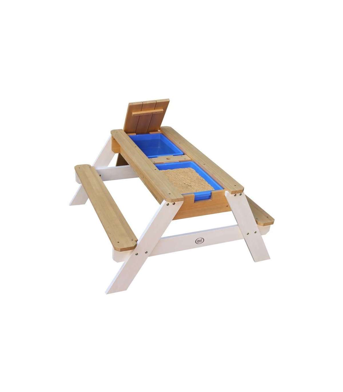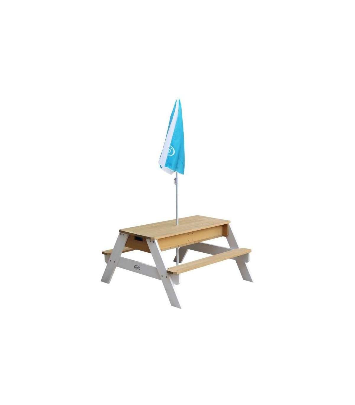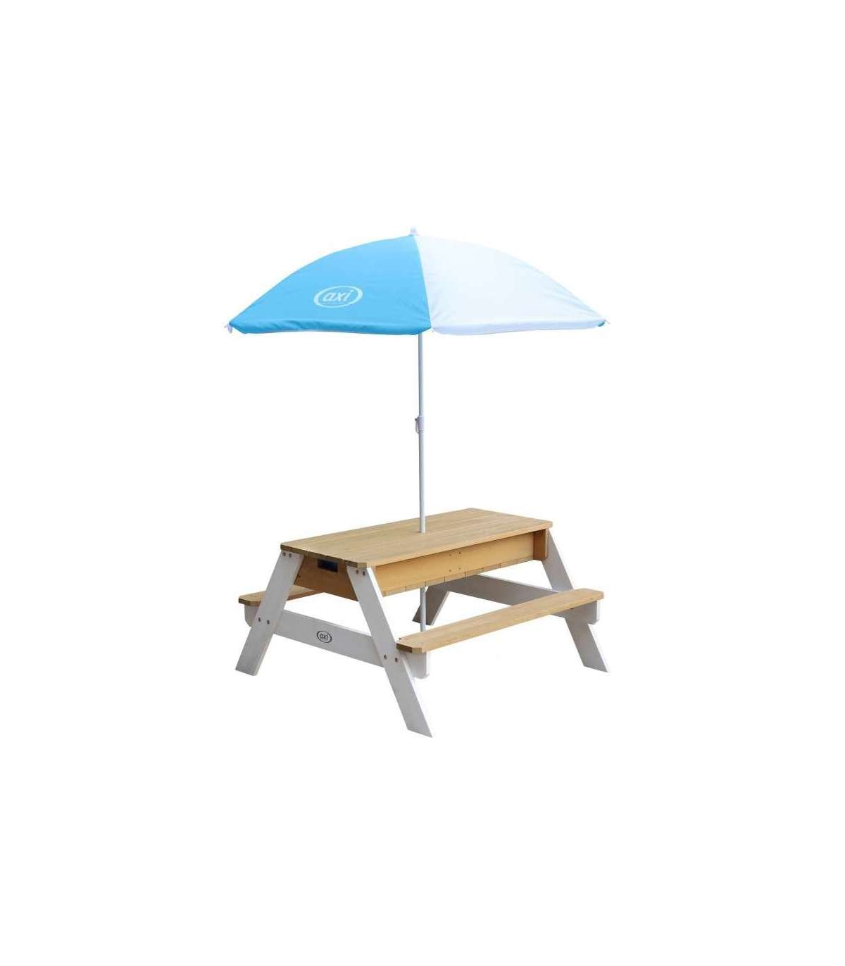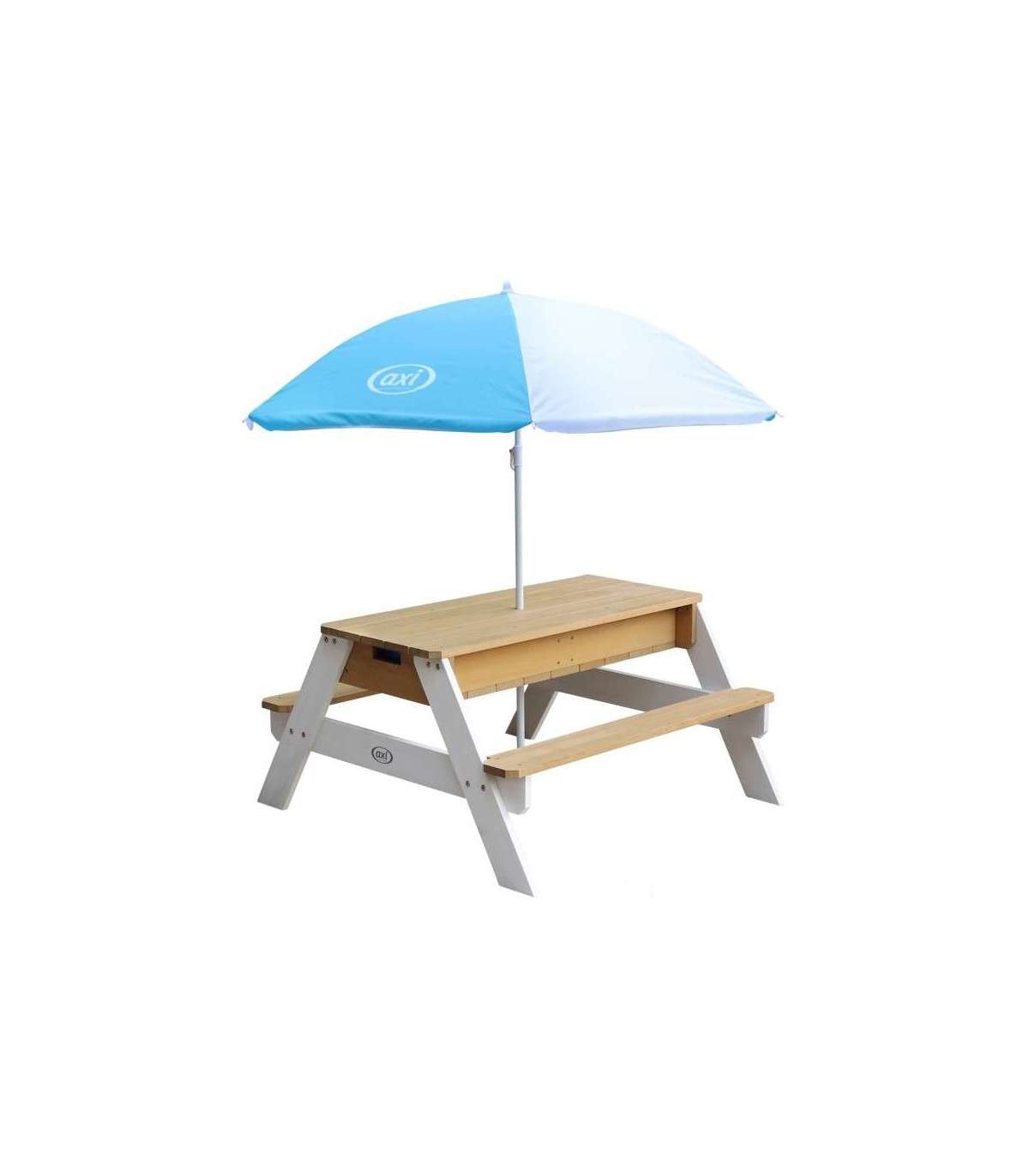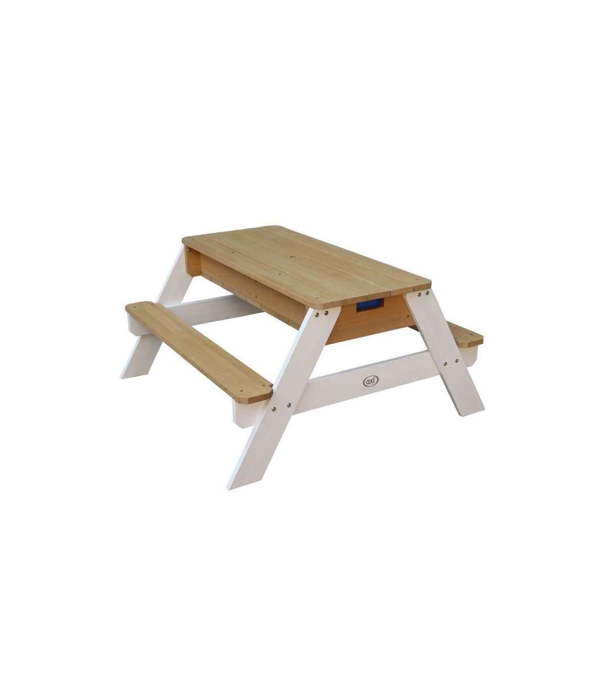 Nicki piknikulaud tuntud margilt AXI on multifunktsionaalne laud, millel on peidetud ladu kahe sinise anumaga eemaldatava lauaplaadi all. Need sinised anumad saab täita liiva ja/või veega, kuid neid võib muidugi kasutada ka mänguasjade hoiustamiseks. Lisaks on anumad eemaldatavad, mis teeb nende puhastamise lihtsaks. Klassikaline liiva ja vee kombinatsioon toimib laste puhul alati! Silmapilkselt saab liiva- ja veelauda muuta piknikulauaks, kus lapsed saavad luua, joonistada või nautida maiustusi.