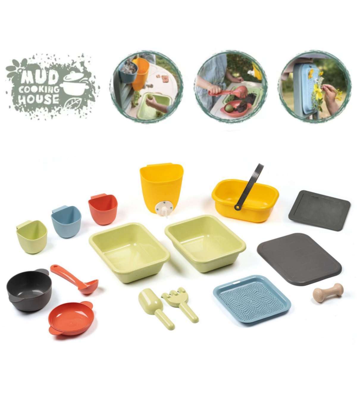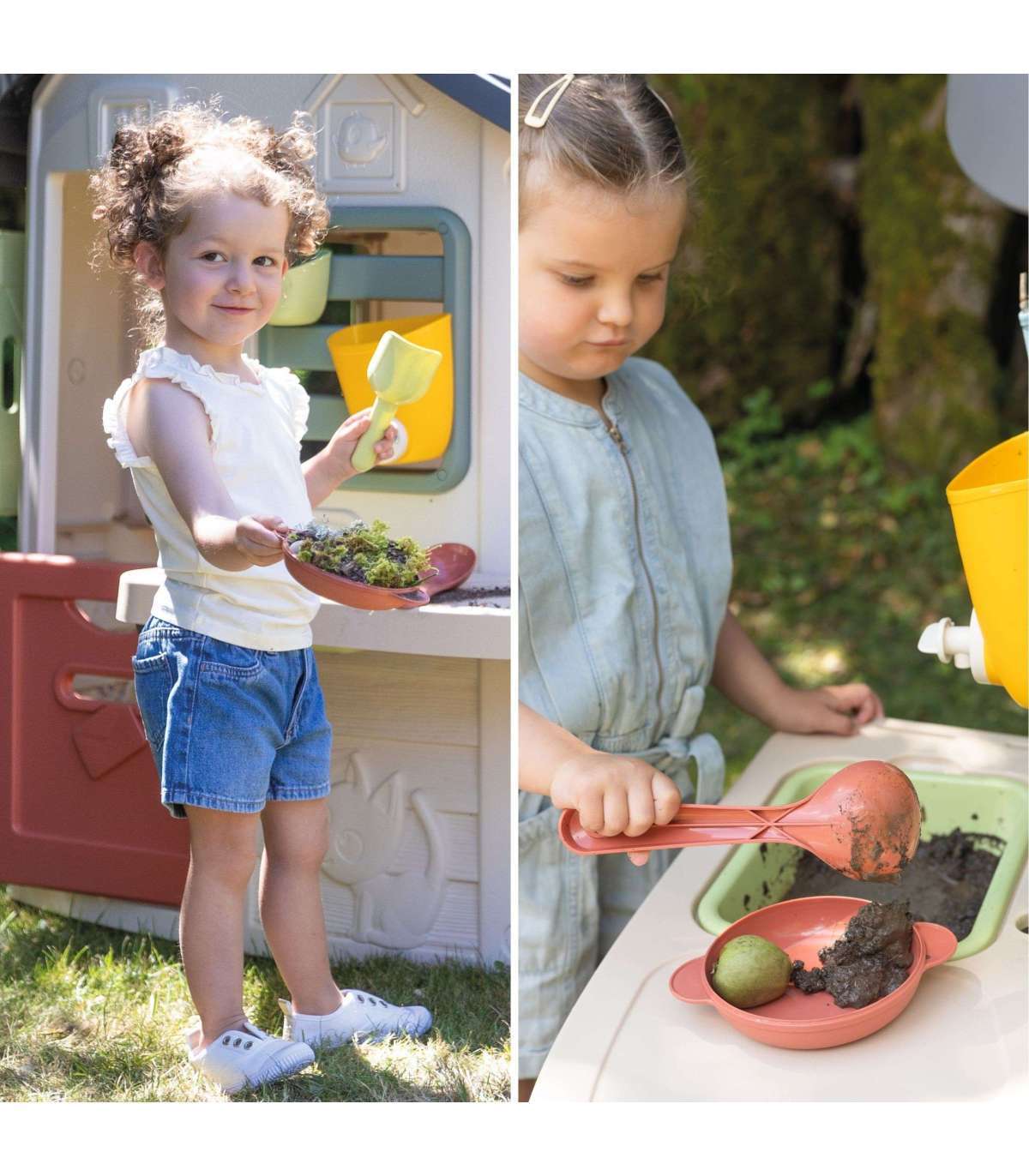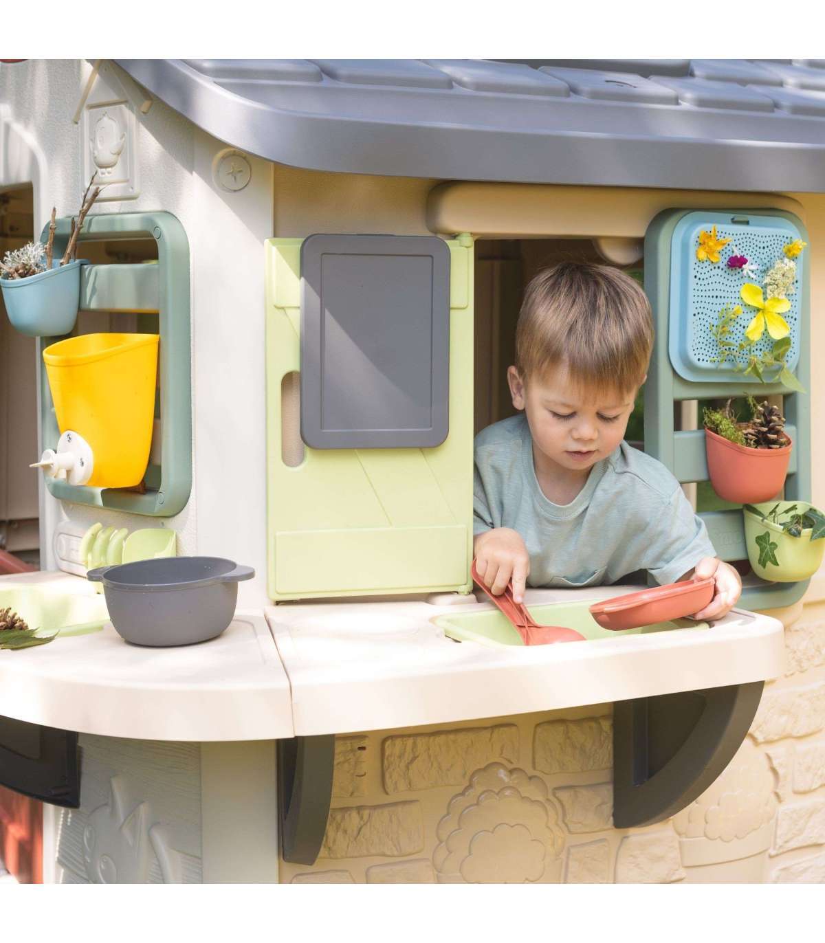 Take your child's play to a whole new level with the Smoby Life Playhouse with Kitchen+ 16 Pieces – a colorful and creative playhouse that combines the joy of play with learning through discovery ! With a set of cooking accessories, a sink, a kitchen counter, and practical shelves, little ones can create their own recipes, experiment with water, sand, and natural materials, and develop their imagination . Designed with safety , durability, and weather resistance in mind, it's perfect for the garden and patio . Its robust construction and attractive design make every moment spent at the playhouse a unique adventure. It's the perfect way to encourage active play, creative thinking, and first "kitchen" discoveries! A significant portion of the plastic used in its construction is recycled.