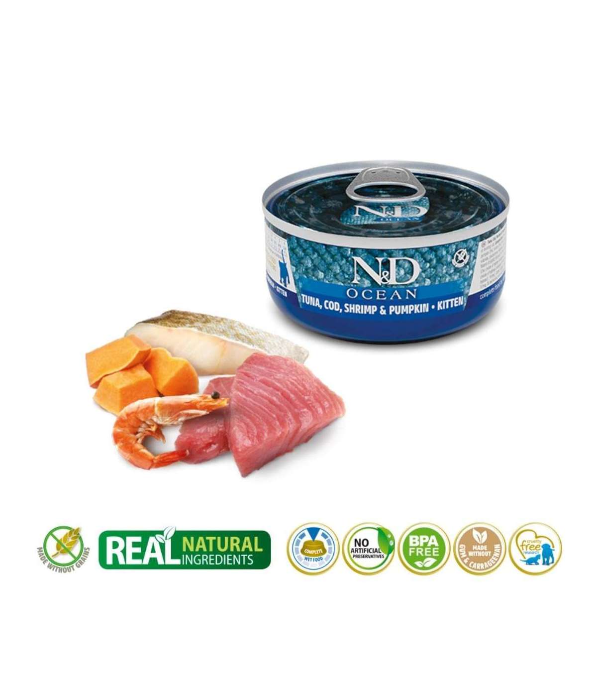 FARMINA N&D Ocean Kitten Tuna, Cod, Shrimp & Pumpkin – wet food for kittens – 70g