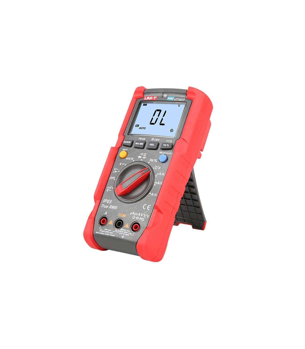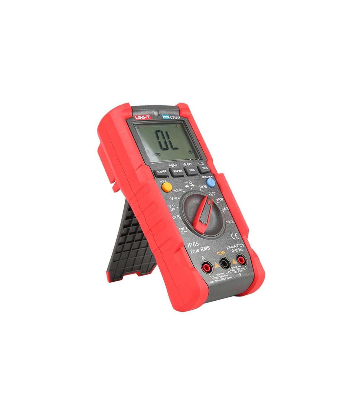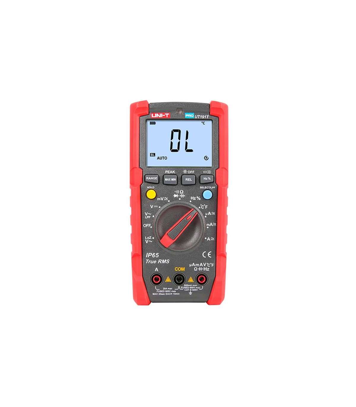 The UNI-T UT191T is a professional digital multimeter designed for use in harsh industrial environments. Equipped with True RMS function, the meter provides accurate measurements of voltage, current, resistance, capacitance, frequency and temperature. The UT191T offers a resolution of 6,000 counts and automatic or manual range selection. The meter's housing meets the IP65 standard and can withstand drops from heights of up to 2 meters, making it an ideal tool for use in harsh and changing conditions.