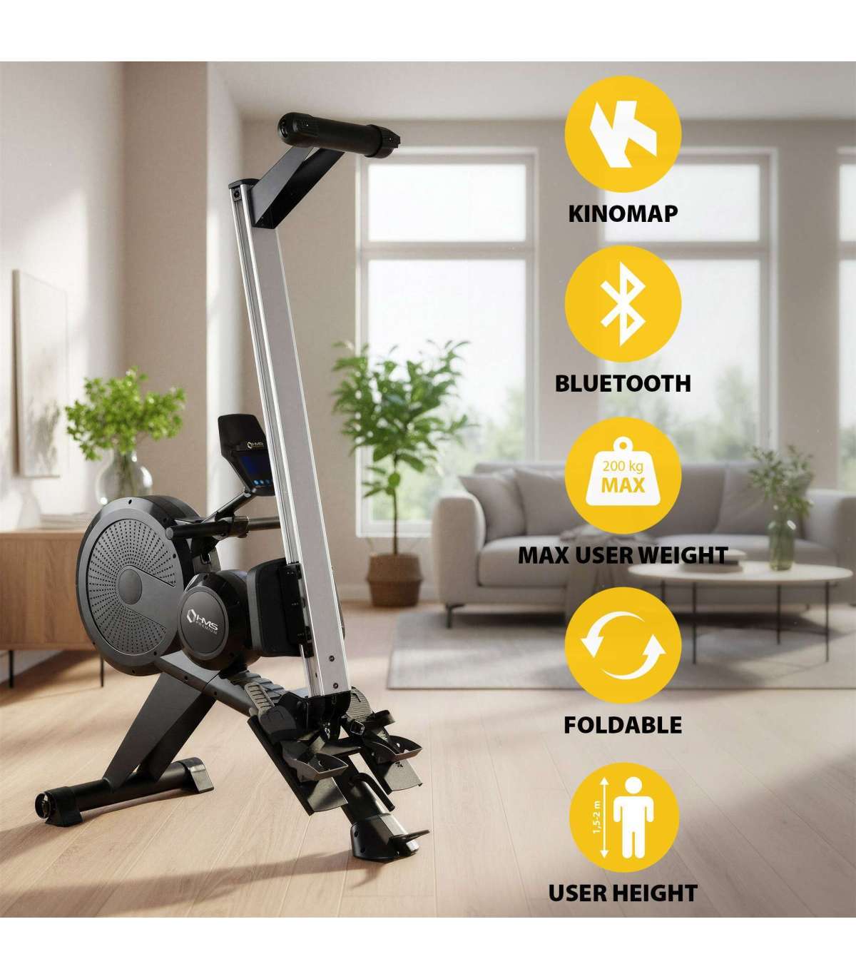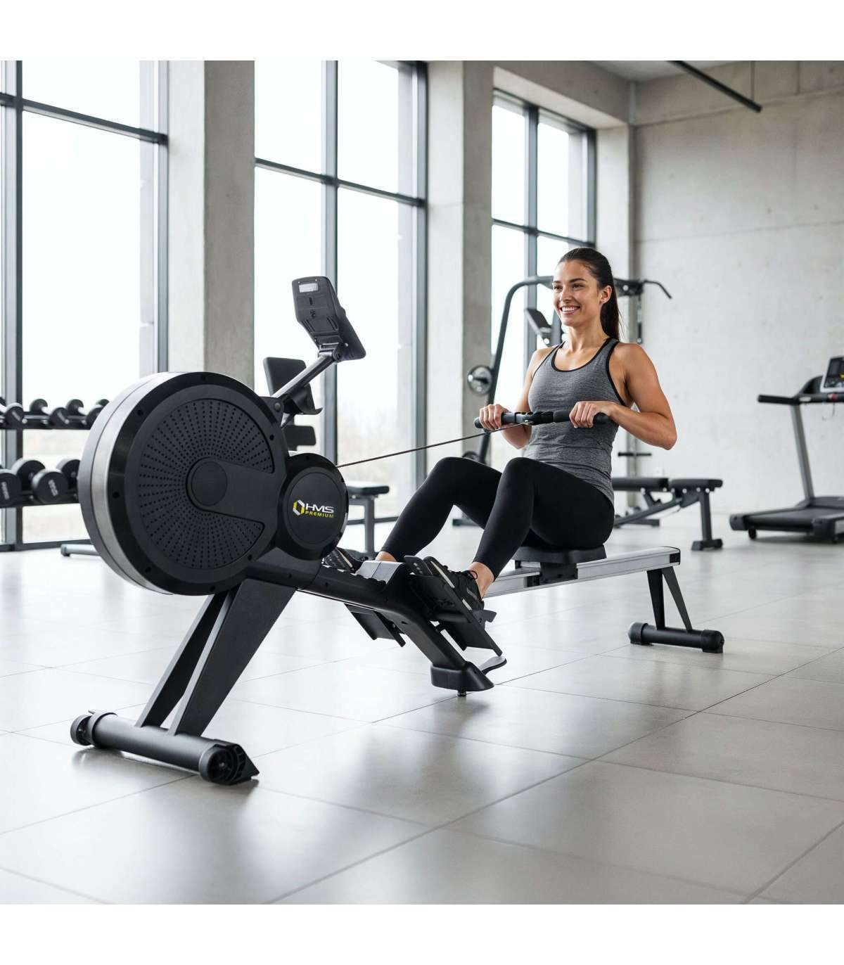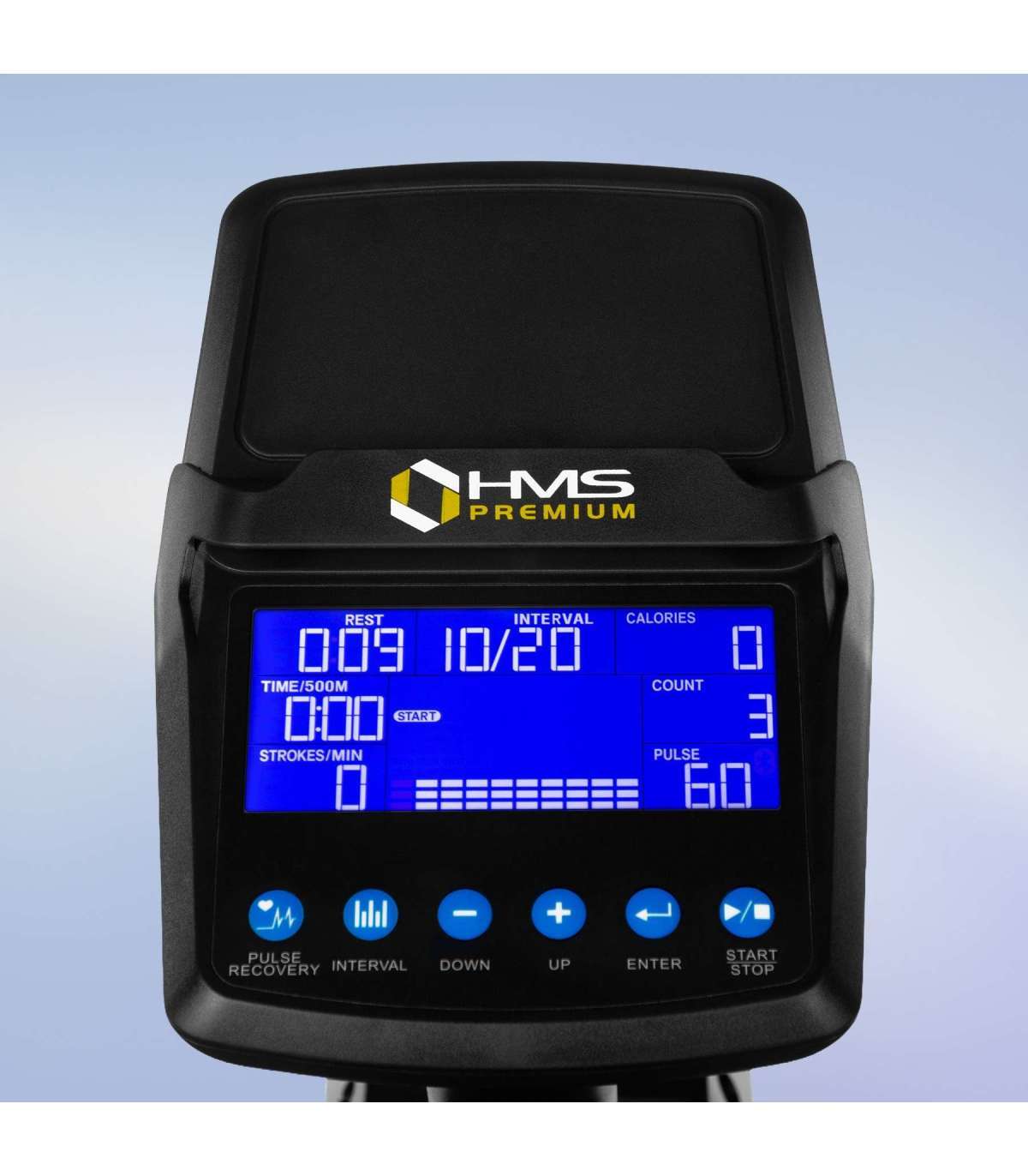 ZM1856 MAGNETIC ROWING MACHINE COMMERCIAL HMS PREMIUMThe ZM1856 HMS Premium rowing machine is an advanced commercial-grade training device, designed for intensive use in fitness clubs, personal training studios and demanding home gyms. Solid construction, modern electronics and Kinomap app compatibility make it a versatile full-body workout solution.Professional quality and robust constructionThe ZM1856 model is made of high-quality materials, ensuring stability, durability and safety even during intense training sessions. This commercial rowing machine meets the expectations of both professionals and ambitious home users. The construction, inspired by professional rowing trainers, provides a realistic and smooth rowing motion.Smooth and natural rowing motionThe integrated 4 kg flywheel ensures smooth and stable operation with an optimal resistance level, allowing both endurance and strength training. The rowing machine is designed to provide a natural and even movement throughout the entire stroke. A 100 cm seat travel range guarantees a full and comfortable range of motion, also for taller users.Modern LCD display and extensive training functionsThe rowing trainer features a clear LCD display showing key workout parameters in real time:time,time/500 m,distance,calories burned,stroke count,heart rate,Additionally, the user has access to 23 training programs, 3 interval modes and 32 levels of electronic resistance adjustment, enabling precise intensity control according to fitness level and training goals.Interactive training with the Kinomap appThanks to compatibility with the Kinomap app, the ZM1856 rowing trainer takes workouts to a whole new level. Interactive routes, online competitions and realistic simulations make training more engaging and motivating.Comfort and ergonomicsThe ZM1856 HMS Premium is designed for maximum comfort:adjustable footrests with length adjustment,ergonomic foot straps,comfortable, contoured seat,smartphone holder for apps or media during training.Mobility and space savingDespite its commercial design, the rowing machine is highly practical:transport wheels for easy relocation,dedicated carrying handle for better ergonomics,folding function to reduce storage space.Ideal choice for gym and home useThe ZM1856 HMS Fitness rowing machine is the perfect solution for users seeking durability, advanced features and professional-grade performance. Ideal for commercial facilities as well as premium home training areas.Specification:Dimensions unfolded: 245 x 57 x 114 cmDimensions folded: 128 x 57 x 192 cmFootrestsLength: 23 – 35 cm7-level adjustmentStabilizing strapSeatDimensions: 25 x 31 cmHeight from floor: 45 cmTravel length: 100 cmTraining handleLength: 46 cmDiameter: 3.7 cmFunctionsTimeDistanceCalories burnedStrokesHeart rateInterval mode32 resistance levelsTime/500 m23 training programsApp: yes (Kinomap)FoldableTransport handlePhone/tablet holderPower supply: 230V / 50HzMaximum user weight: 150 kgProduct weight: 40 kgNotes:24-month warranty for home use12-month warranty for commercial useImporter: Abisal Ltd. | Poland | 41-807 Zabrze | Pyskowicka Street 17 | e-mail: abisal@abisal.plAbisal Ltd.. declares that the products sold by the company are safe and meet the requirements contained in the Act on General Product Safety of December 12, 2003. (Journal of Laws of December 31, 2003)