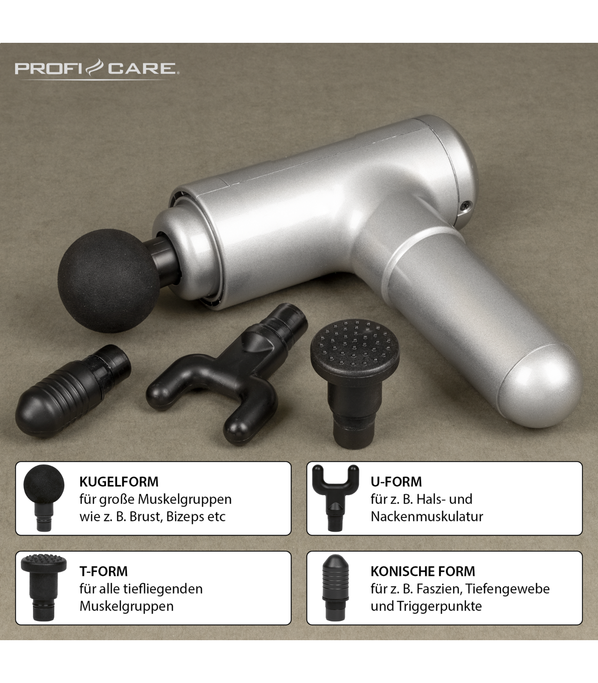 Elektriline massaažipüstol Proficare 4 vahetatava kinnitusega sügavvibratsioonimassaažiks.