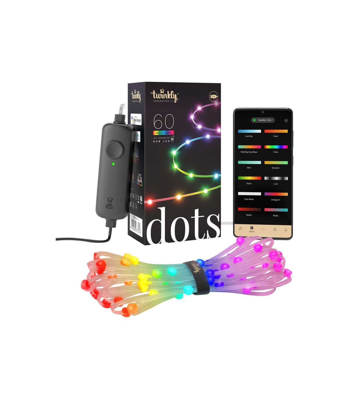 Twinkly|Dots Smart LED Lights 60 RGB (Multicolor), USB Powered, 3m, Transparent|RGB – 16M+ colors