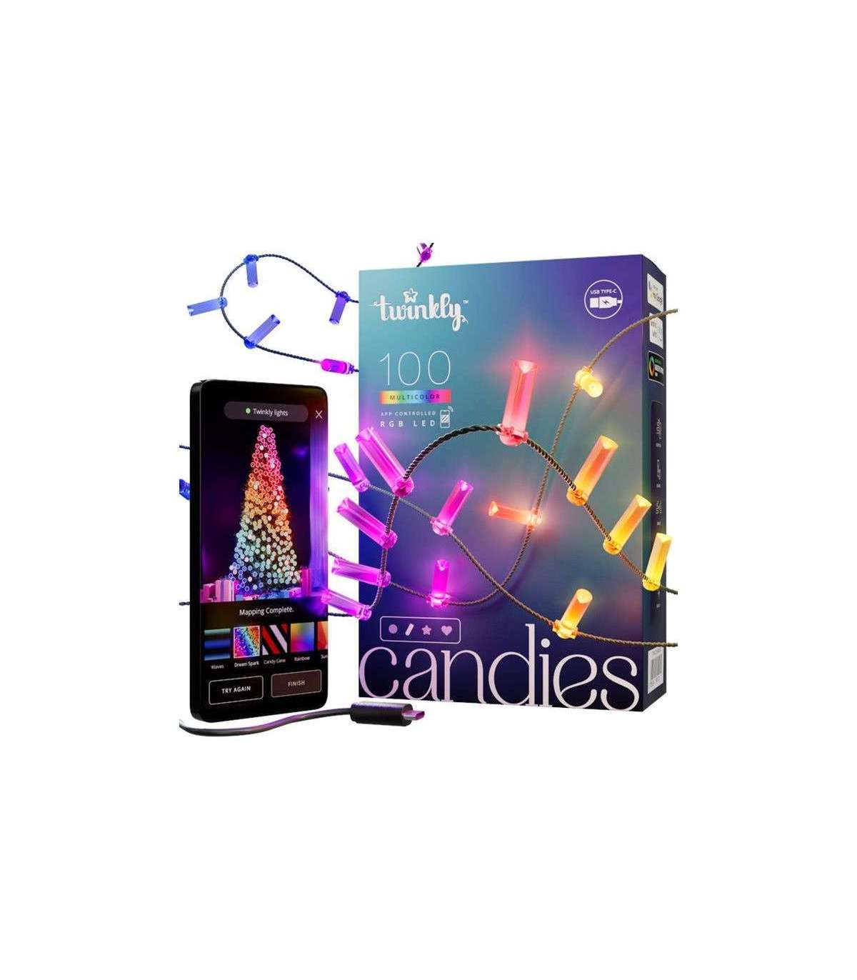 - Candies 100 Candle-shaped RGB LEDs, Clear Wire, USB-C