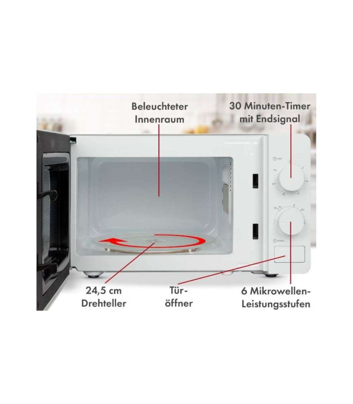 Praktiline pöördtaldrik, läbimõõduga u. 24,5 cm, tagab toidu ühtlase kuumenemise ning 30-minutiline lõpusignaaliga taimer annab toitude valmimisest õigeaegselt teada.