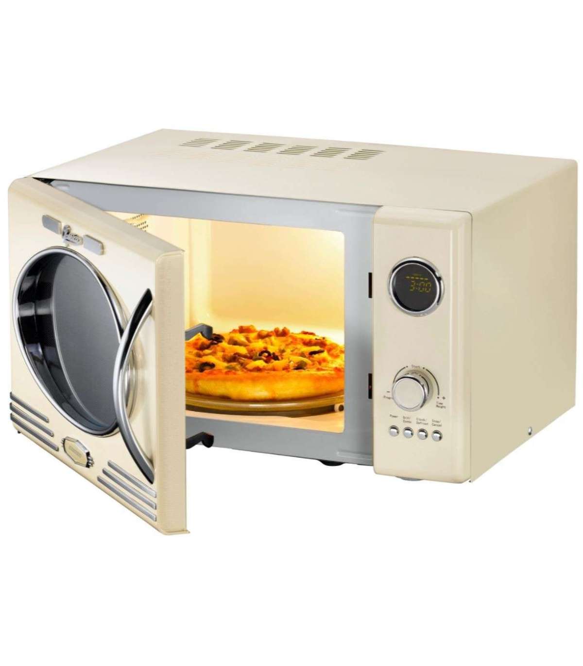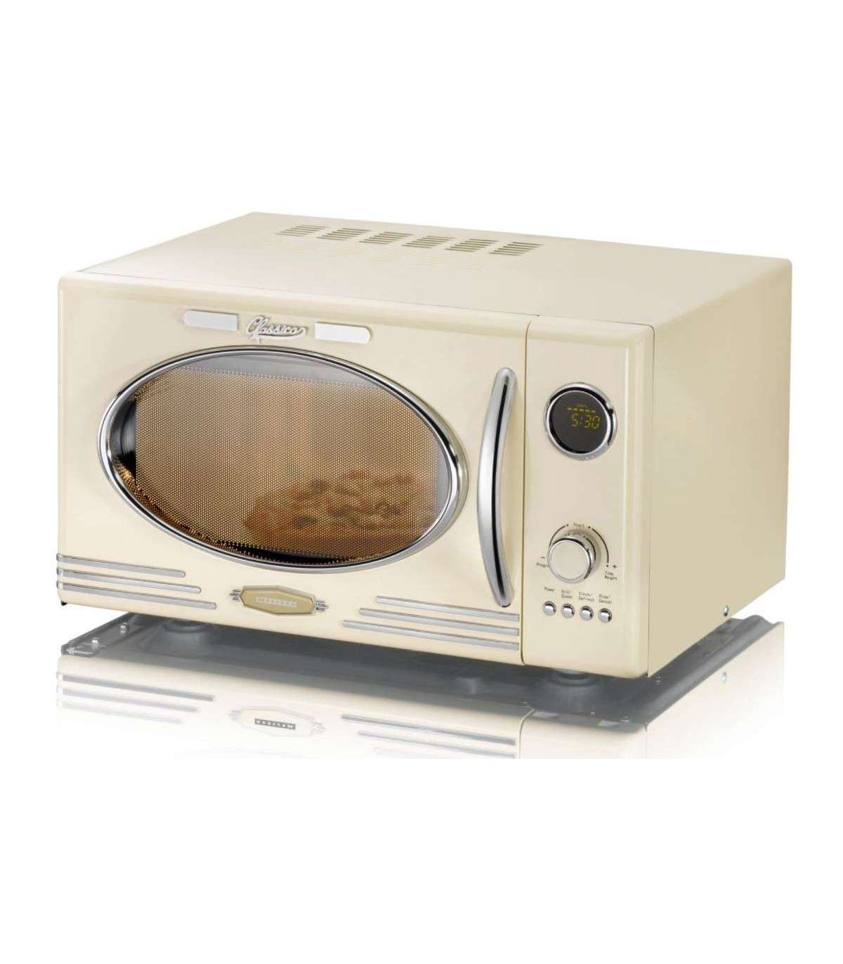 Pilkupüüdev kroomitud detailidega beeži värvi retro stiilis grill-funktsiooniga mikrolaineahi kiireks toiduvalmistamiseks ning kuumutamiseks.