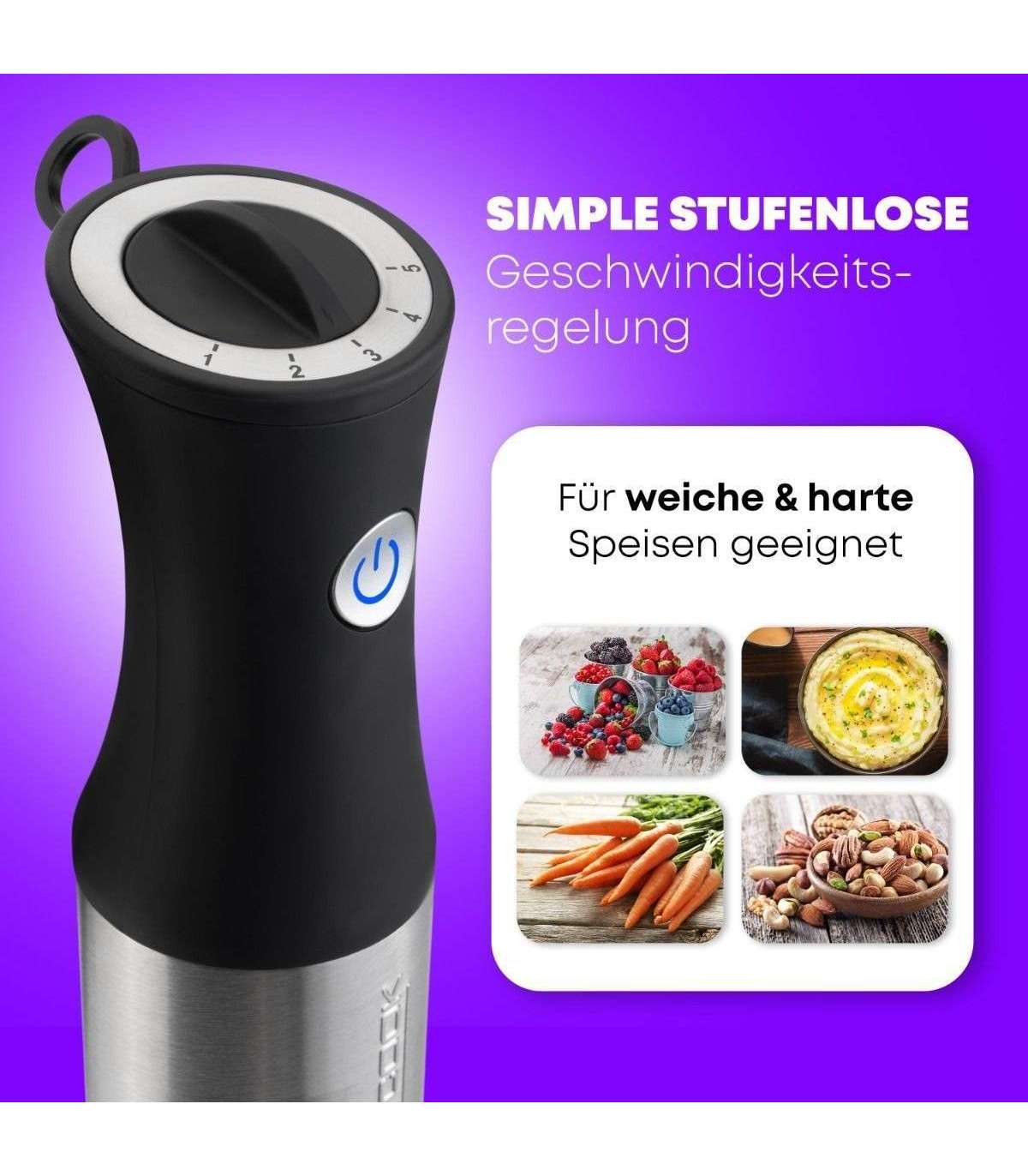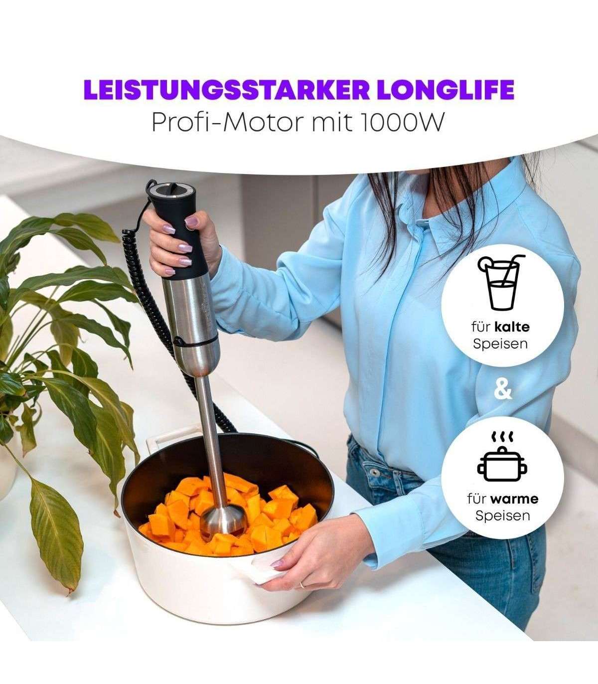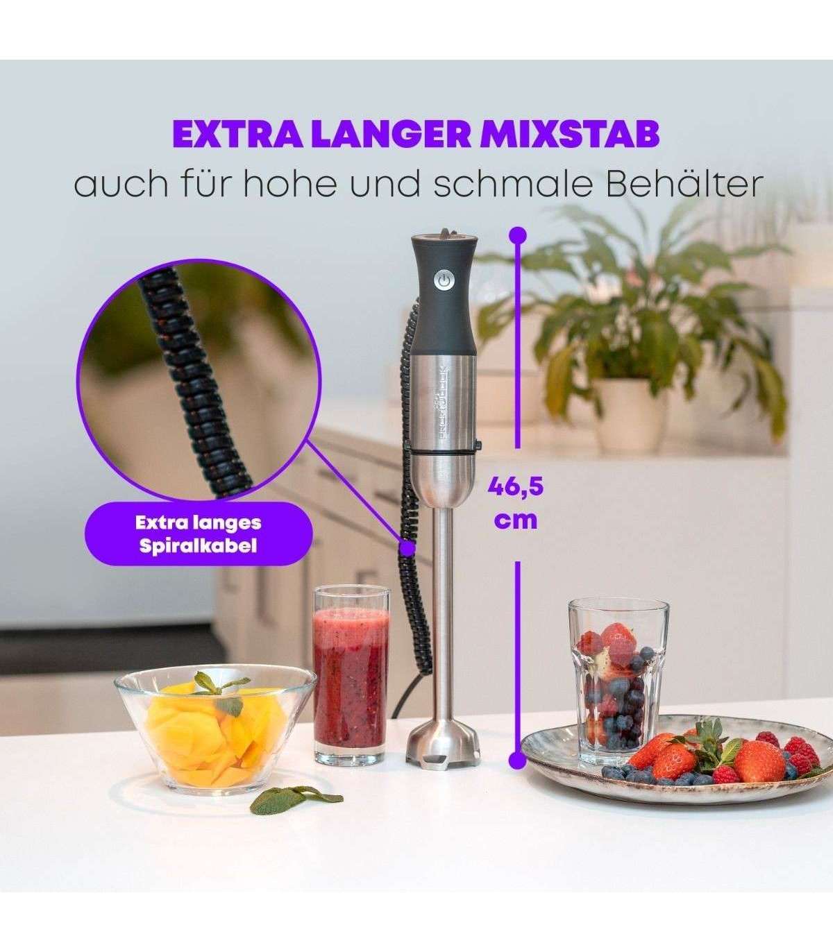 Võimas Longlife-Profi 1000 W-se mootoriga ja Soft Touch-Griff ergonoomilise käepidemega roostevabast terasest saumikser
