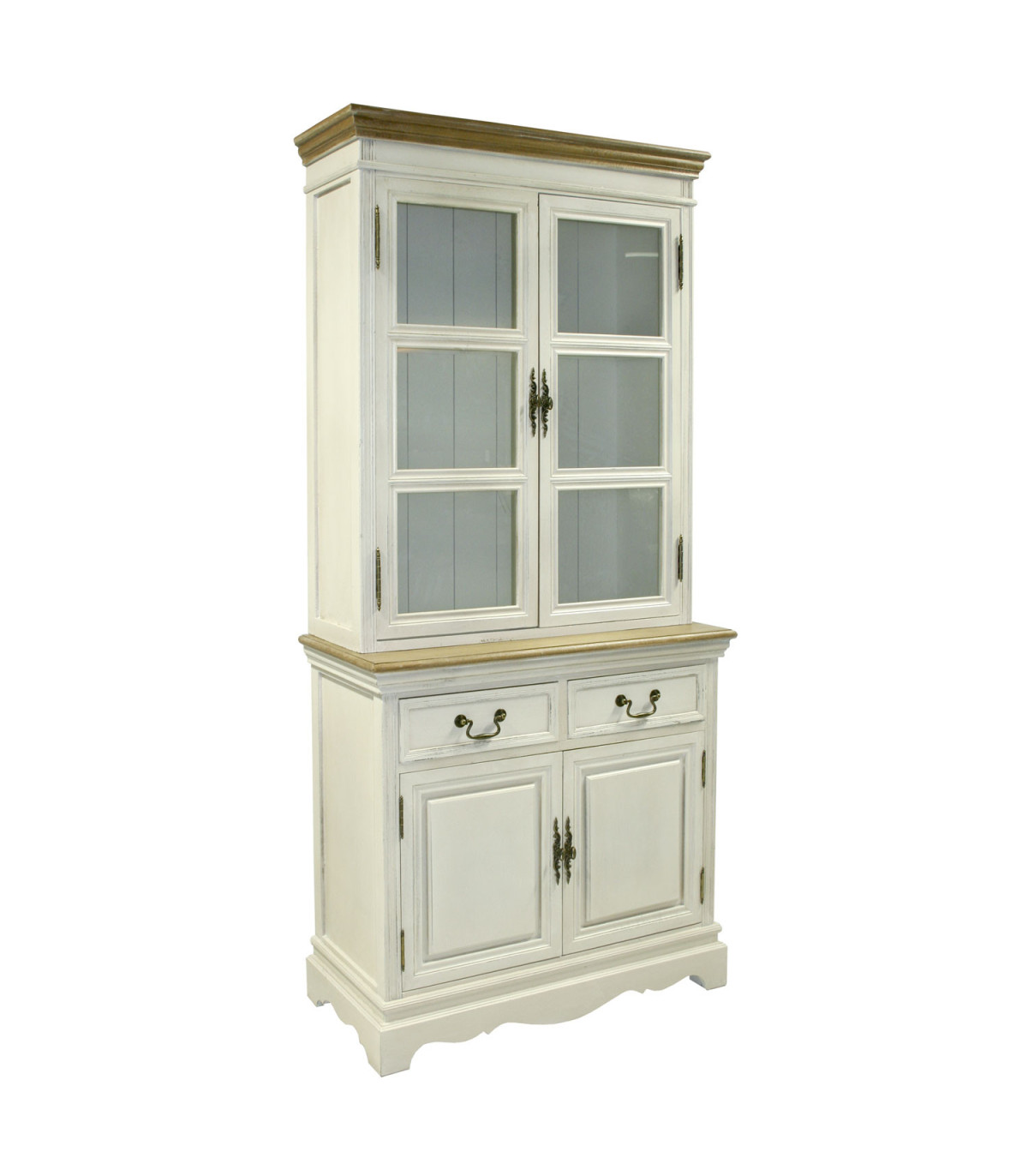Vitriinkapp SAMIRA 85,5x39,5/31xH189,5cm, antiikvalge/naturaalne. Vitriinkapi põhikonstruktsioon, uksed ja sokkel on valmistatud saarepuidust, MDF küljepaneelid. Kapp on viimistletud antiikvalge värviga. Alumise kapi pealmine MDF plaat on kaetud naturaalse paulownia spooniga. Ülemine profiilliist on valmistatud naturaalses toonis paulownia puidust. Ülemiste klaasuste taga on kaks vaheriiulit. Alumises kapis on üks vaheriiul. Kapil on kaks ilma siinideta sahtlit. Sahtlitel ja ustel on metallist käepidemed.