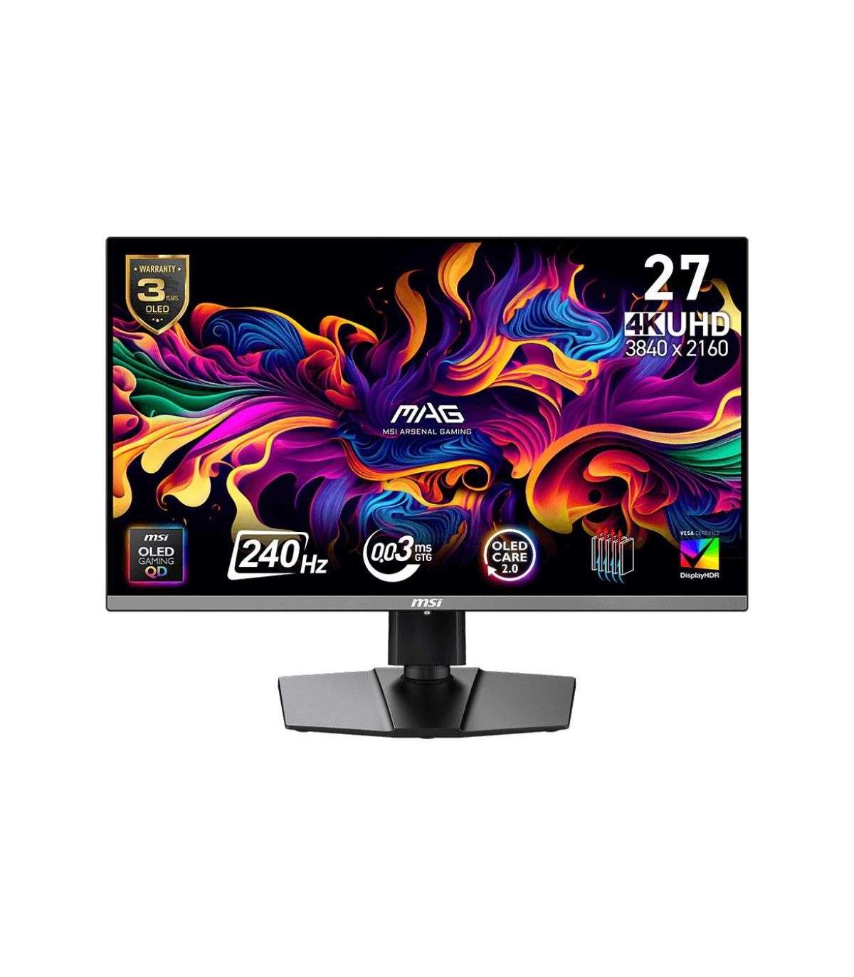 Visualize your victory with the MAG 272UP QD-OLED X24 gaming monitor. It boasts a 3840 x 2160 (UHD) next-gen QD-OLED panel, 240Hz refresh rate, and rapid 0.03ms (GtG) response time. VESA certification for ClearMR 13000 and DisplayHDR True Black 400 ensures exceptionally vivid images and mitigates motion blur. OLED Care 2.0 reduces OLED burn-in risks. For console gamers, the MAG 272UP QD-OLED X24 provide HDMI 2.1 ports with 48Gbps bandwidth, 120Hz support, VRR, and ALLM.