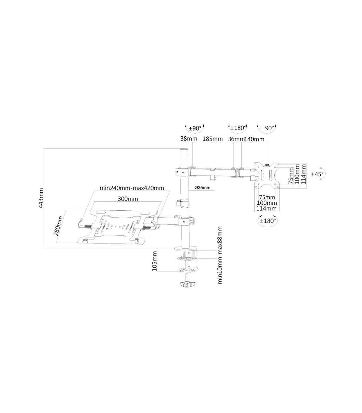 The Neomounts by Newstar desk mount, model FPMA-D550NOTEBOOK is a tilt-, swivel and rotatable desk mount for flat screens up to 32? notebooks up to 15,6". This mount is a great choice for space saving placement on desks using a desk clamp or grommet. Neomounts by Newstars? unique tilt (+45°/-45°), swivel (180°) and rotate (360°) technology allows the mount to change to any viewing angle to fully benefit from the capabilities of the flat screen. The mount is manually height adjustable from 0 to 44 centimetres. Depth adjustable from 4 to 52 centimetres. A unique cable management conceals and routes cables from mount to flat screen. Hide your cables to keep the workplace nice and tidy. Neomounts by Newstar FPMA-D550NOTEBOOK has three pivot points and is suitable for screens up to 32". The weight capacity of this product is 8 kg for the screen and 4,5 kg for the notebook. The desk mount is suitable for screens that meet VESA hole pattern 75x75 or 100x100mm. Different hole patterns can be covered using Neomounts by Newstar VESA adapter plates. By using an ergonomic mount neck- and back complaints can be avoided. Ideal for use in offices and on counters or in a reception area. All installation material is included with the product.