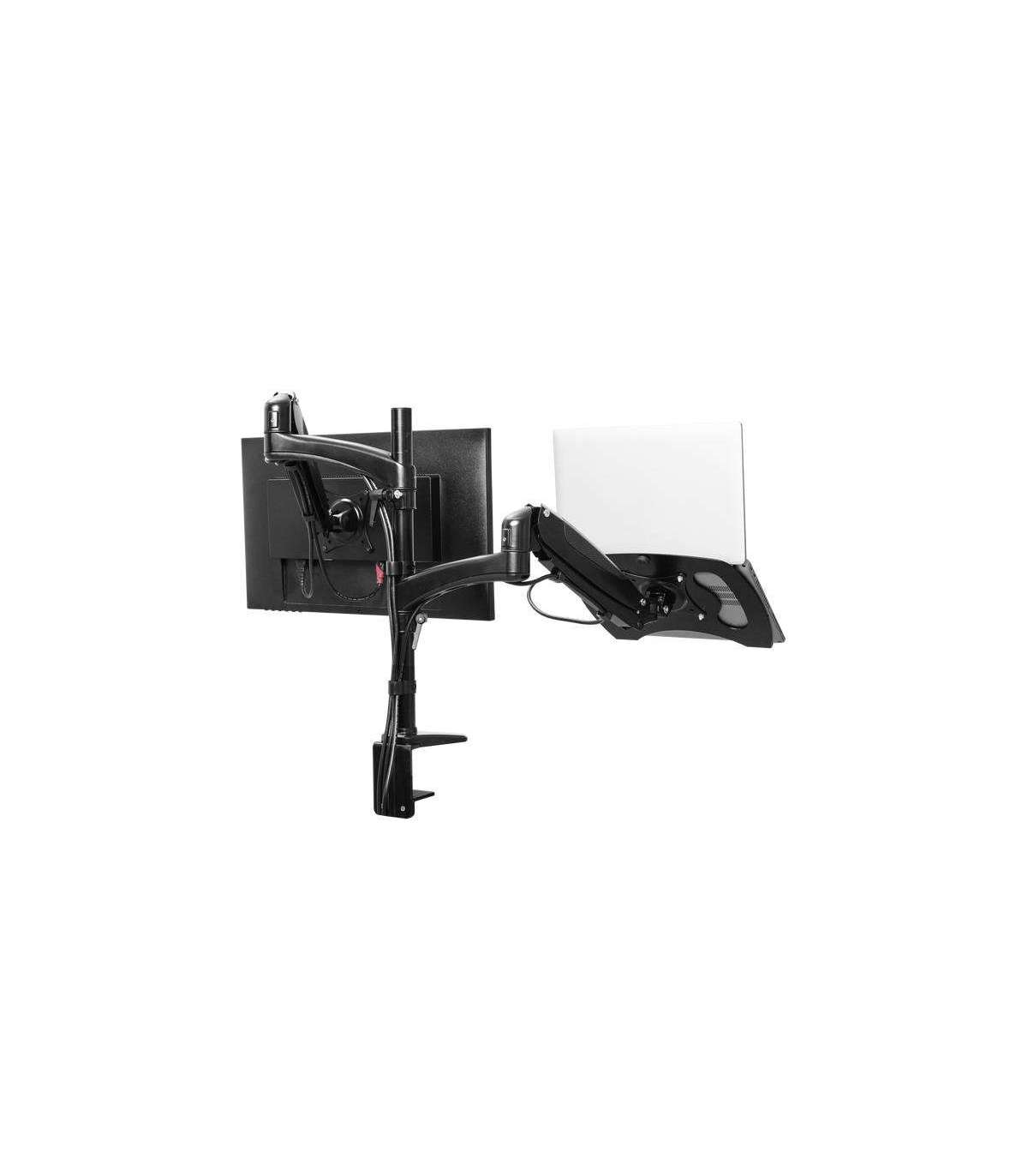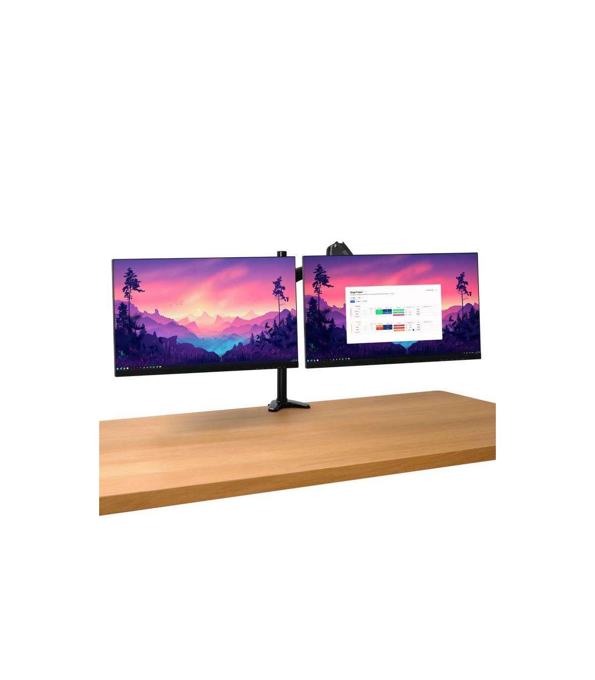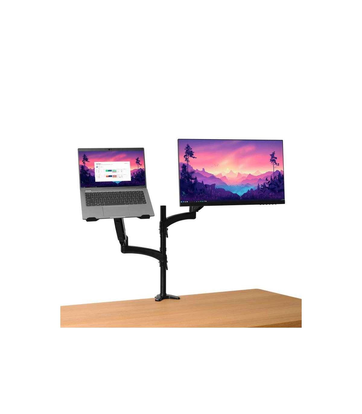 Ergonomic dual monitor & laptop arm for working seated or standing.
