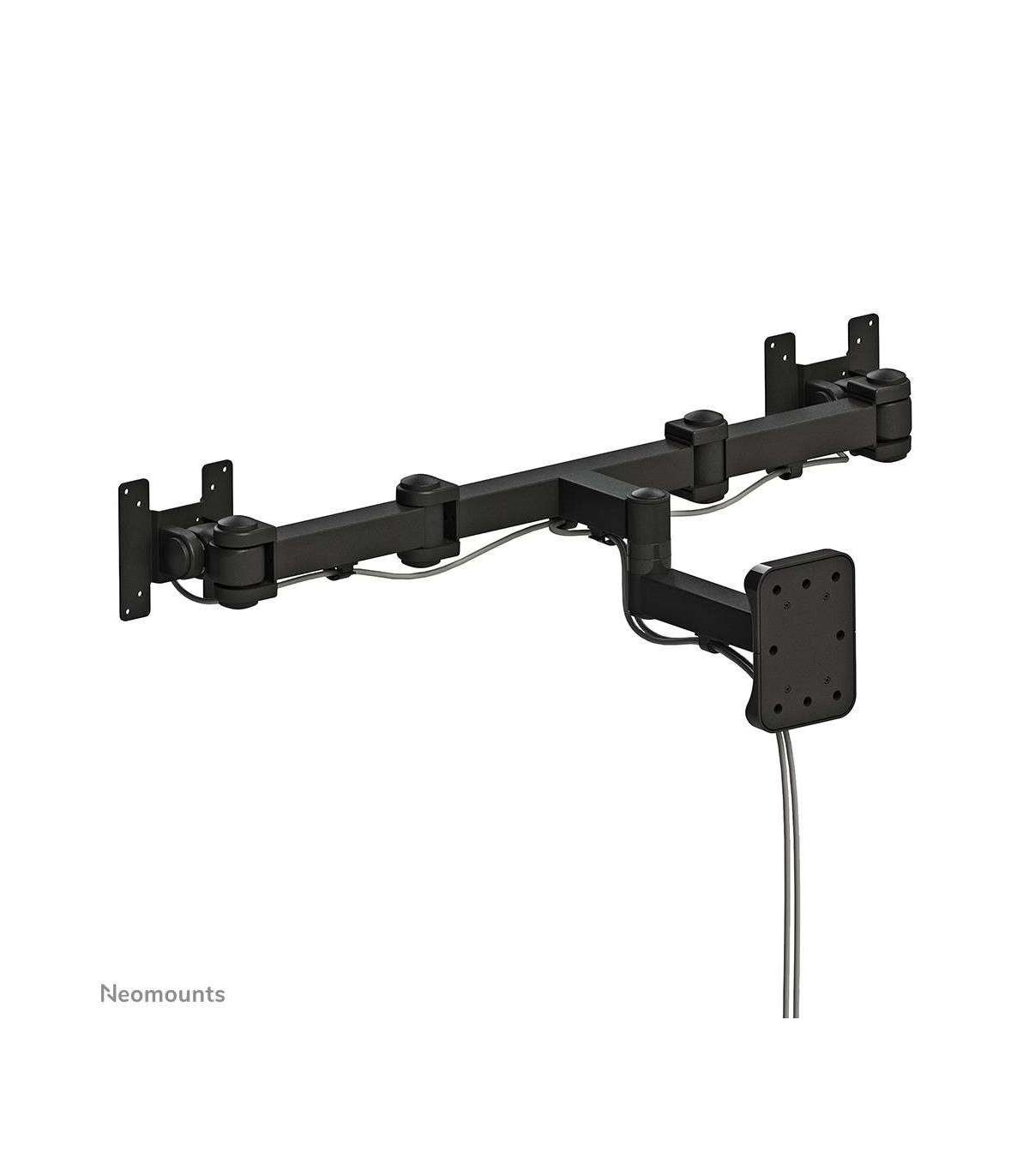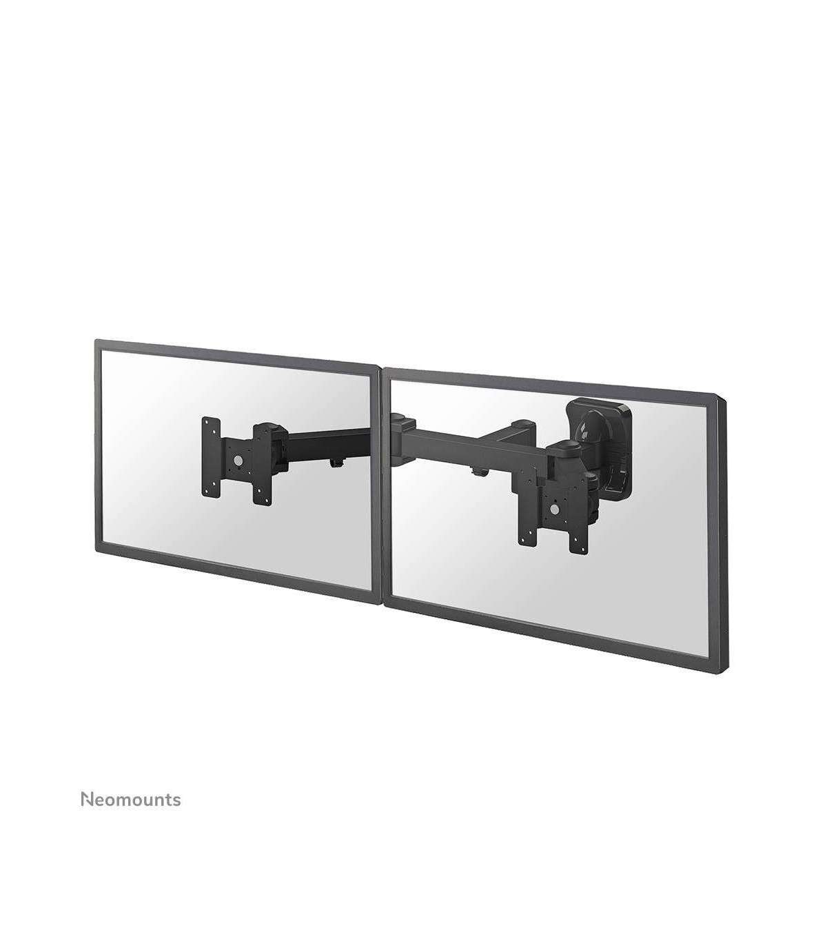 The NewStar FPMA-W960D is a tilt-, swivel and rotatable wall mount for two flat screens up to 27”. This mount is a great choice when you want the ultimate viewing flexibility with your flat screen. Effortless pull the display out from the wall, position it in almost any direction, turn it around corners and then smoothly return it to the wall when finished.
