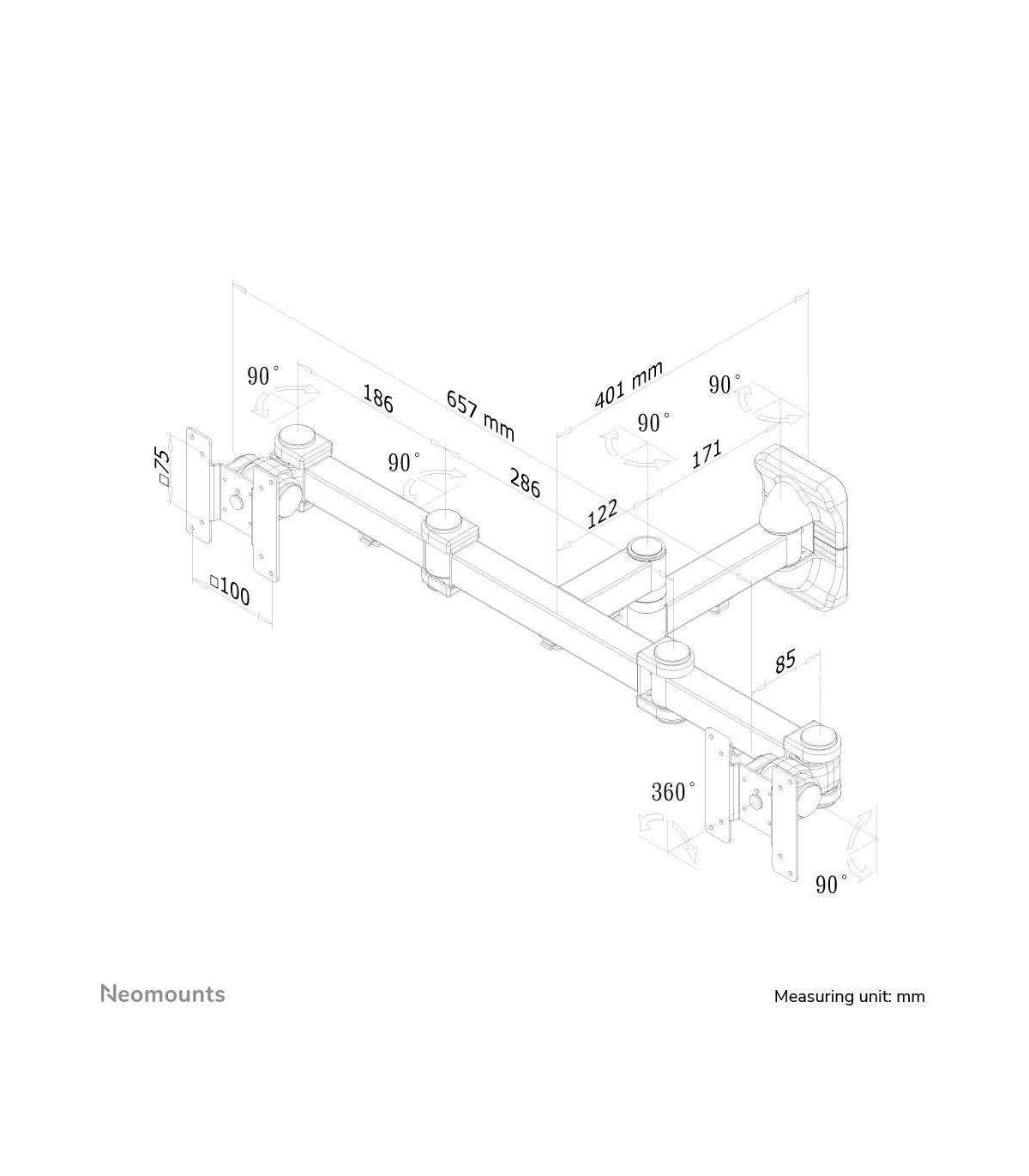NewStar FPMA-W960D has three pivot points and is suitable for screens up to 27" (69 cm). The weight capacity of this product is 6 kg each screen. The wall mount is suitable for screens that meet VESA hole pattern 75x75 to 100x100 mm. Different hole patterns can be covered using NewStar VESA adapter plates.